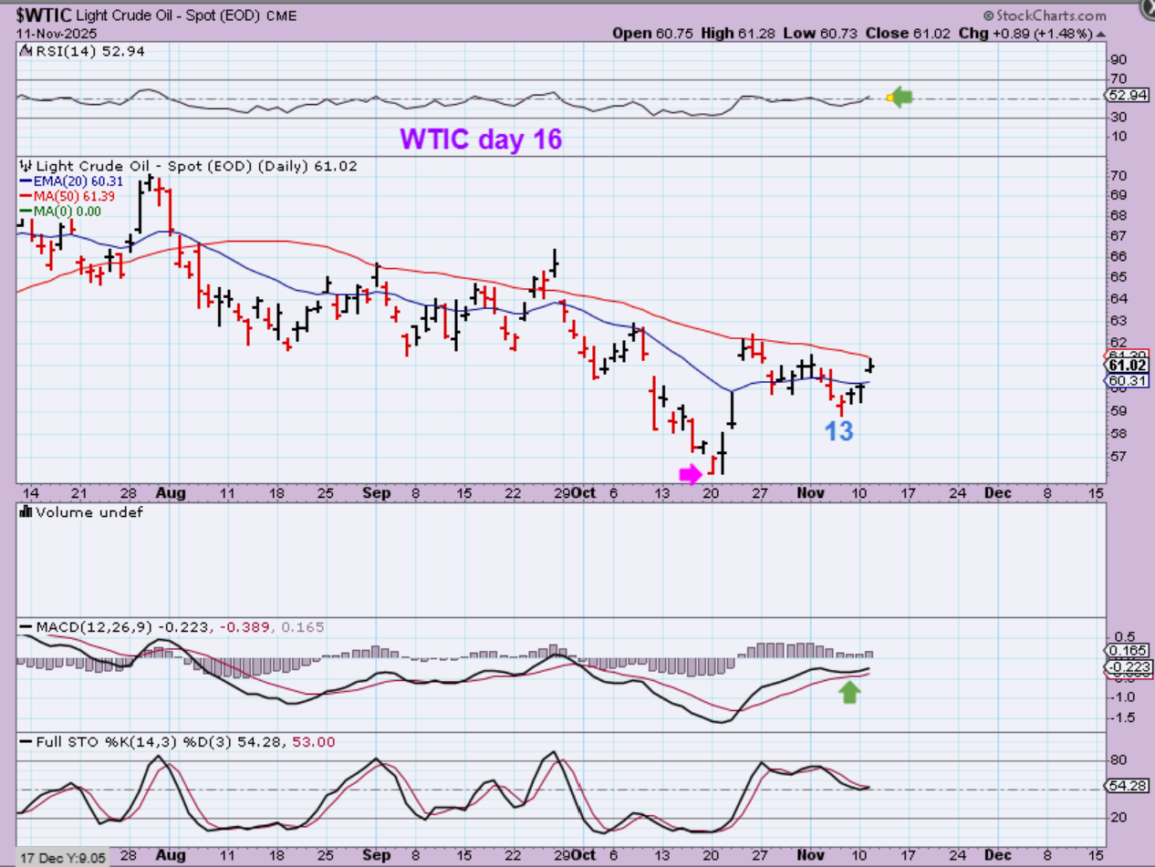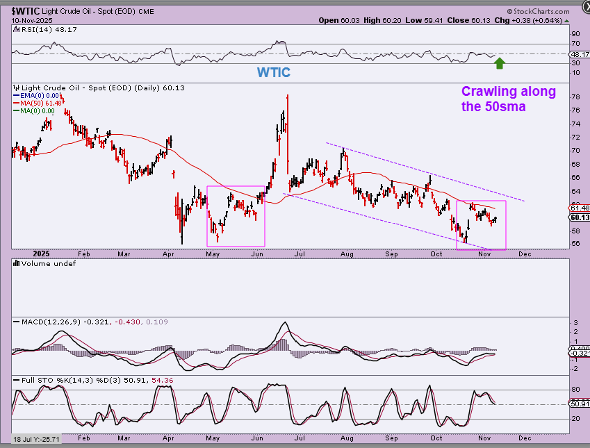 WTIC – Oil is crawling along the 50sma, and I have mentioned that we may be seeing an ICL. Oil has been weak except for that last ICL where we saw Oil blast off due to a Mideast war conflict arising. After that Pop, it just started trending lower for weeks. Oil may remain weak and choppy, but it should break above the 50sma and could run to $70 (UCO, USO or Oil stocks might offer a trade).