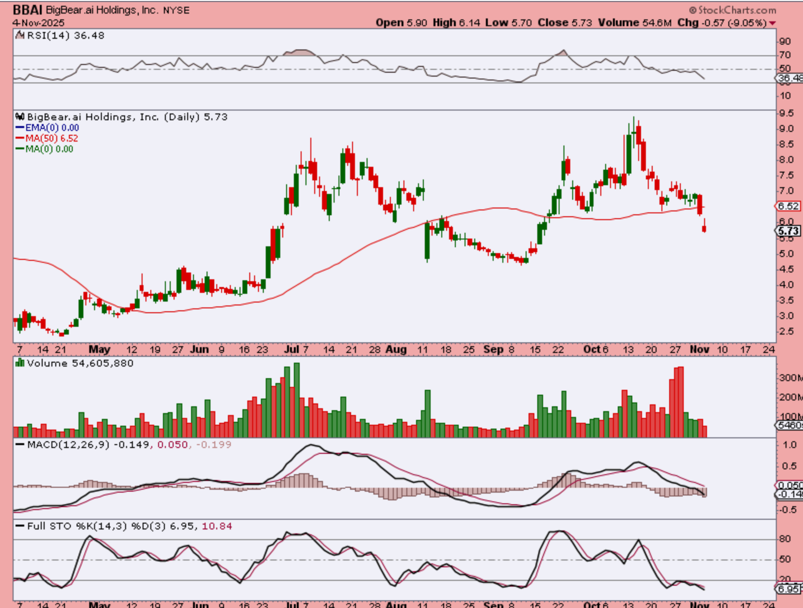 BBAI is looking weak. It lost the 50sma in September too, but it made a new high with a weaker RSI & MACD and now lost the 50sma again and volume is high…