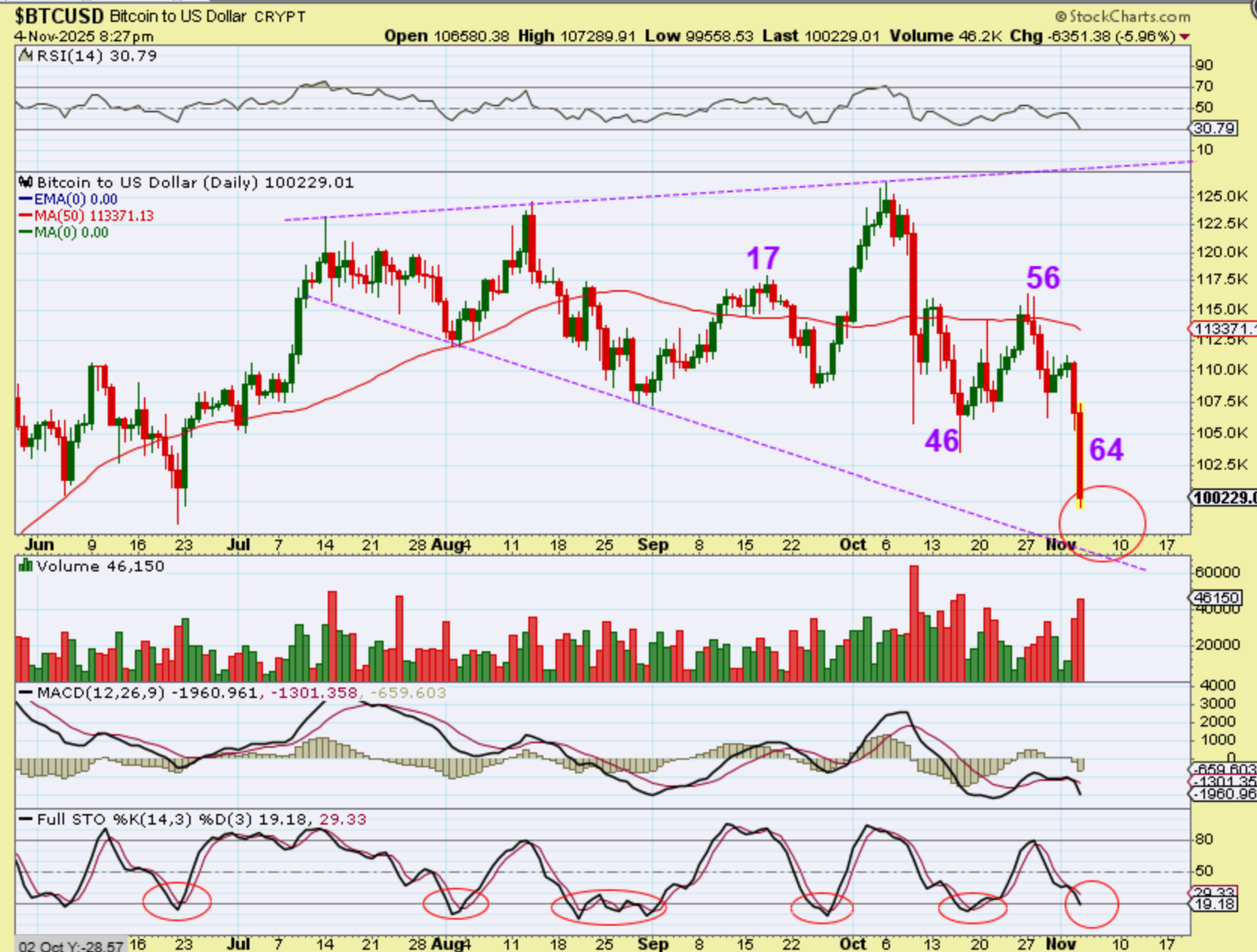 BITCOIN – This is 11 p.m. and we see that we finally got a bounce in that Tuesday day 64 candle, and then a new candle shows up with a drop and recovery. That was a higher low so THIS Might be day 1. We are also finally as oversold as past sell down lows.