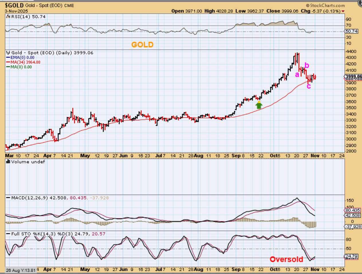 GOLD should be on day 5 yesterday, but I mentioned day 34 just in case we drop to the 50sma (see the following chart). I still think that the a-b-c drop gave us a dcl, we just need a push higher to confirm that. So…