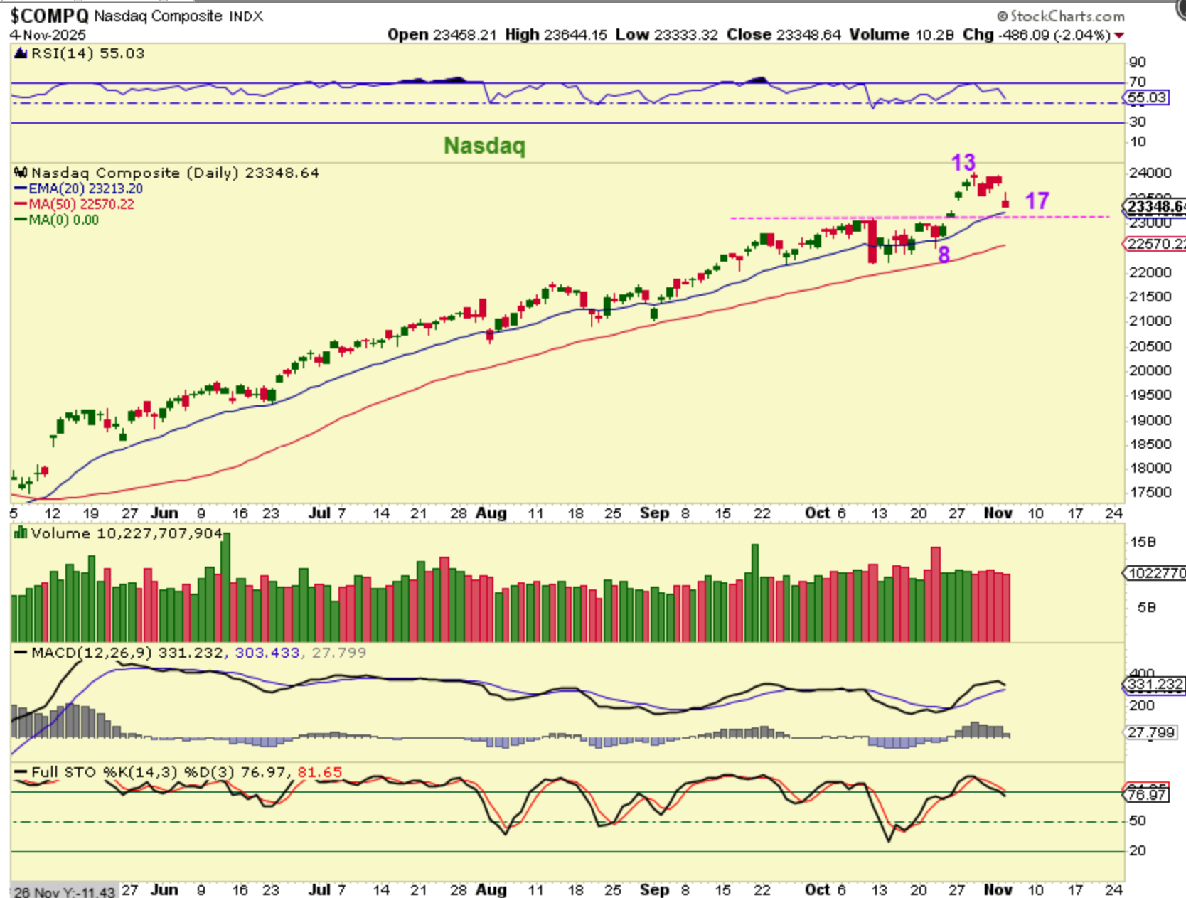 THE NASDAQ is on day 17 and this could be a half cycle dip, but as I mentioned, several of the stocks that I trade often are losing the 50sma. I’ll show you that shortly…