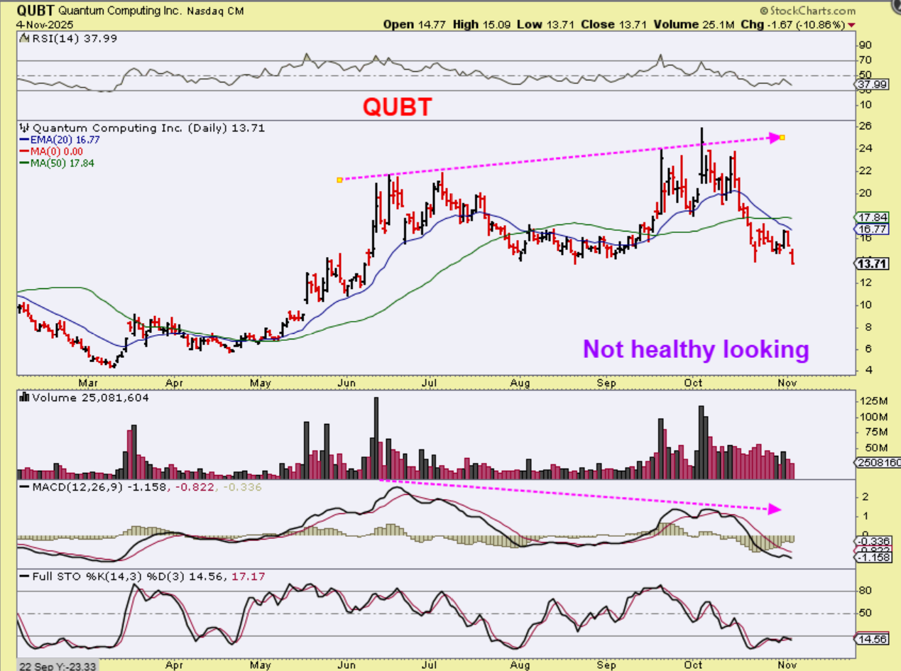 QUBT Some of those super strong Quant stocks are looking pretty weak. When QUBT lost the green 50sma 2 weeks ago, it could not recover. $26 to $13 is Not what the buy and hold group invest in, so we’ve been seeing some selling increases. SO WE KEEP IN MIND THAT…