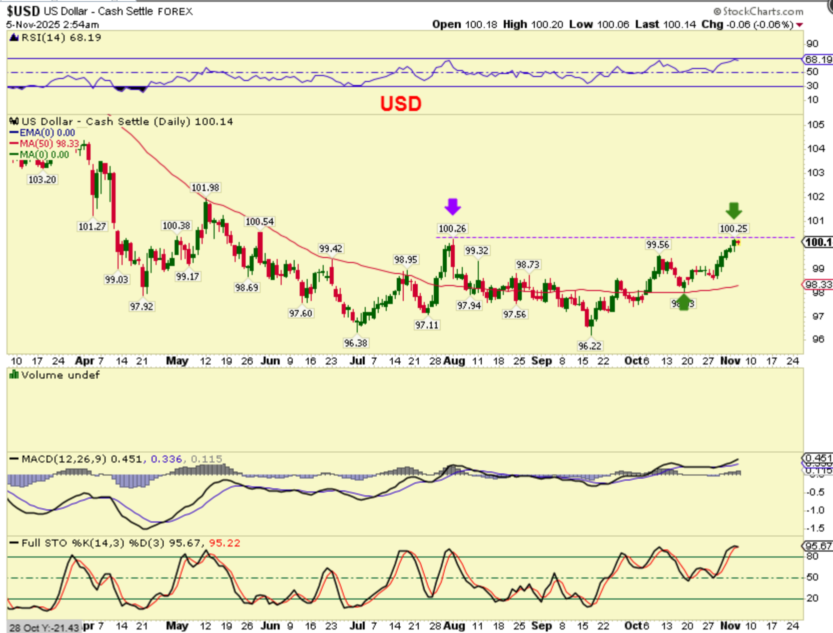 THE USD was .01 away from a new high, but I am seeing that it has made a new high in premarket at 100.27, so the USD finally has that new high and that signals a change here. We could trend higher with higher highs and higher lows. The good news? Gold and Silver are up pre-market too.
