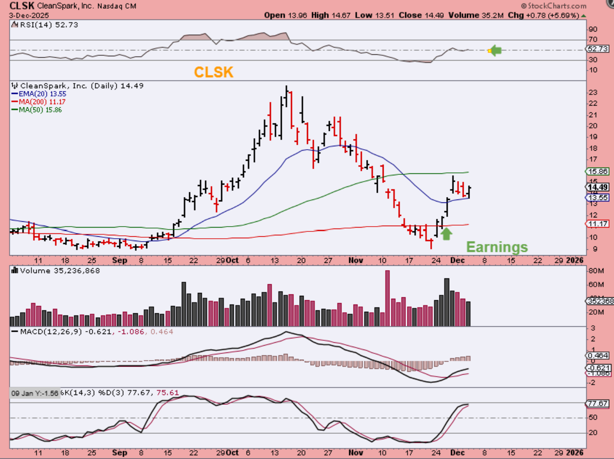 CLSK, IREN, HUT, etc are now below the 50sma. It still looks like a bullish reversal at the 20ema, so you could buy it with a stop under that support.
