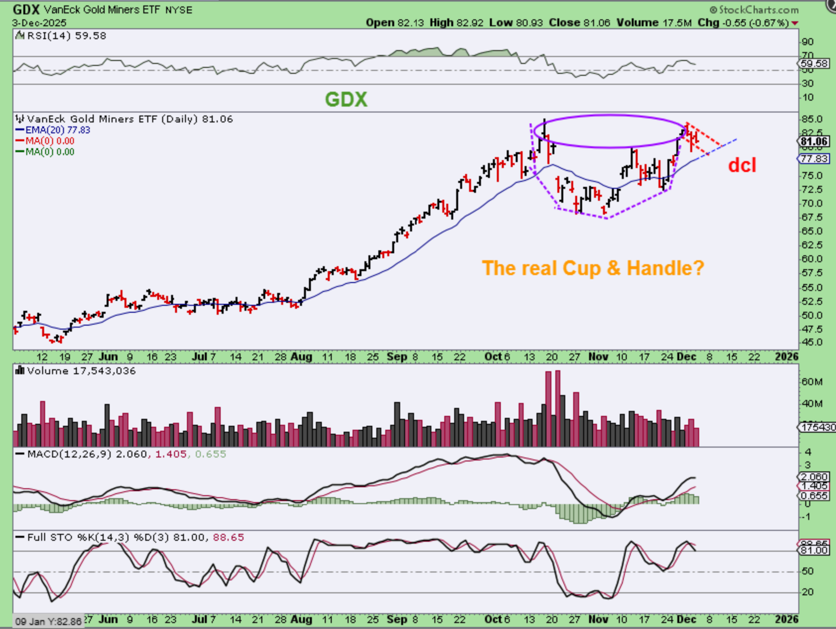 GDX has been chopping ‘sideways to lower’ this week. It may just be a dip into a dcl at the 20 ema, and could form a small handle to a cup. GDX is following Gold.