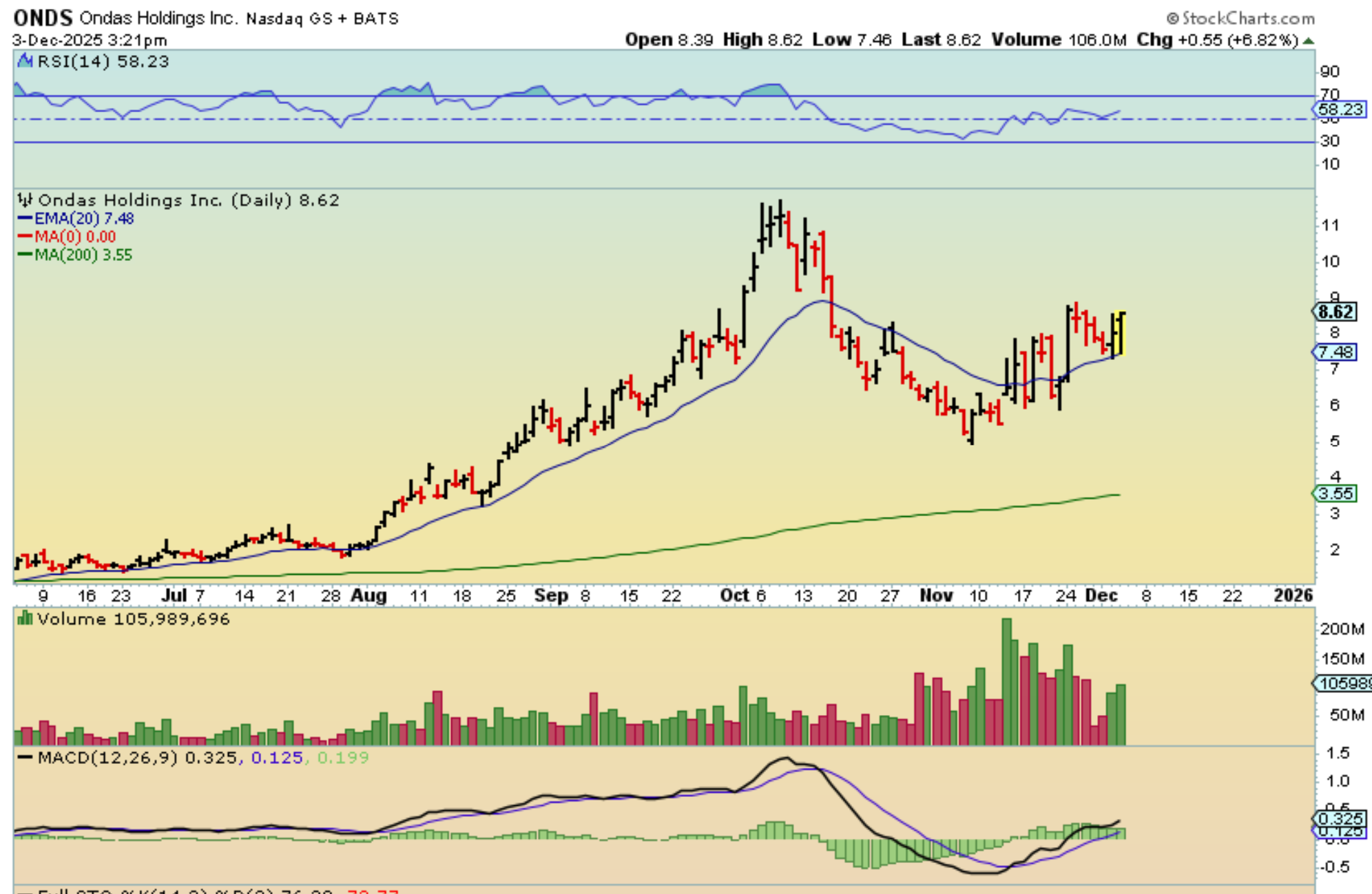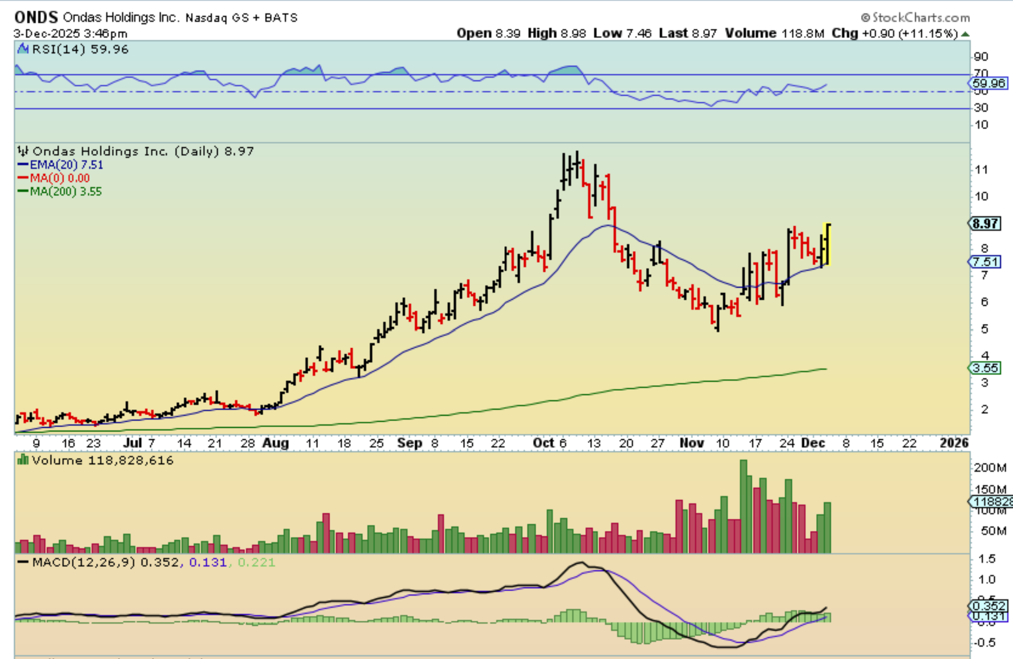 ONDS dropped to the 20ema again, but then it took off higher. I had it here at up 6%, but