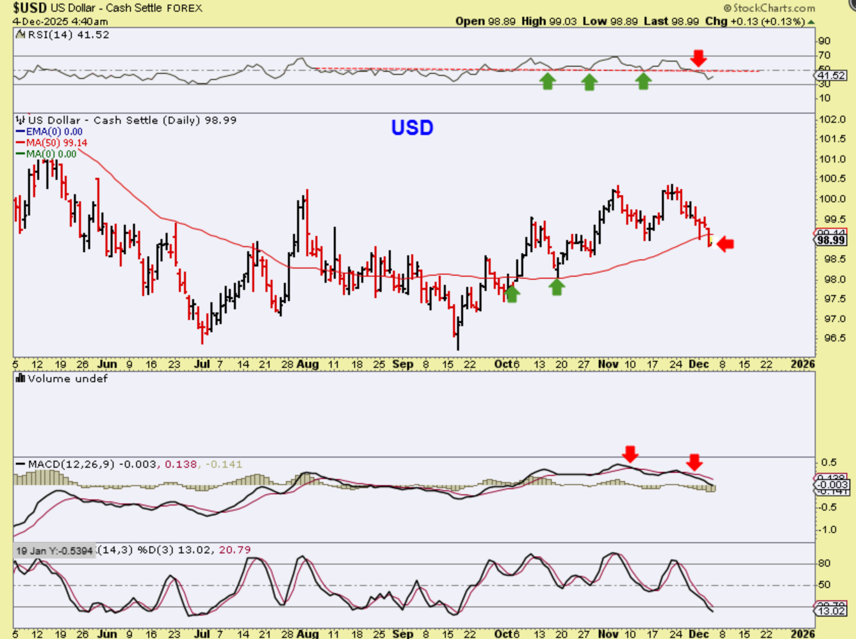 The last 2 peaks for the USD had negative MACD divergence, and the RSI is losing the 50% line. The USD appears to be weakening with ‘Rate Cut’ chatter and Gold and Especially Silver are pushing higher.