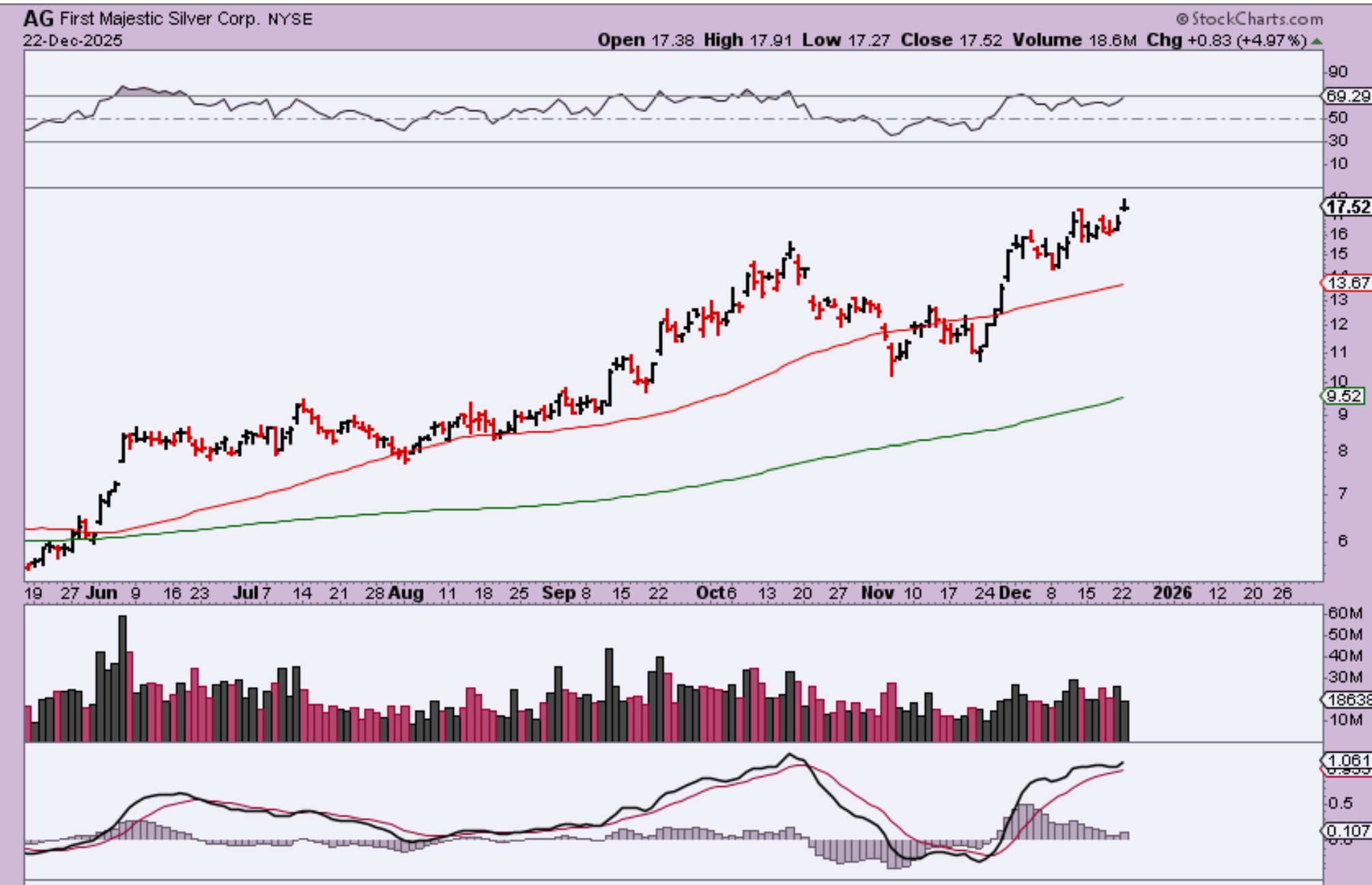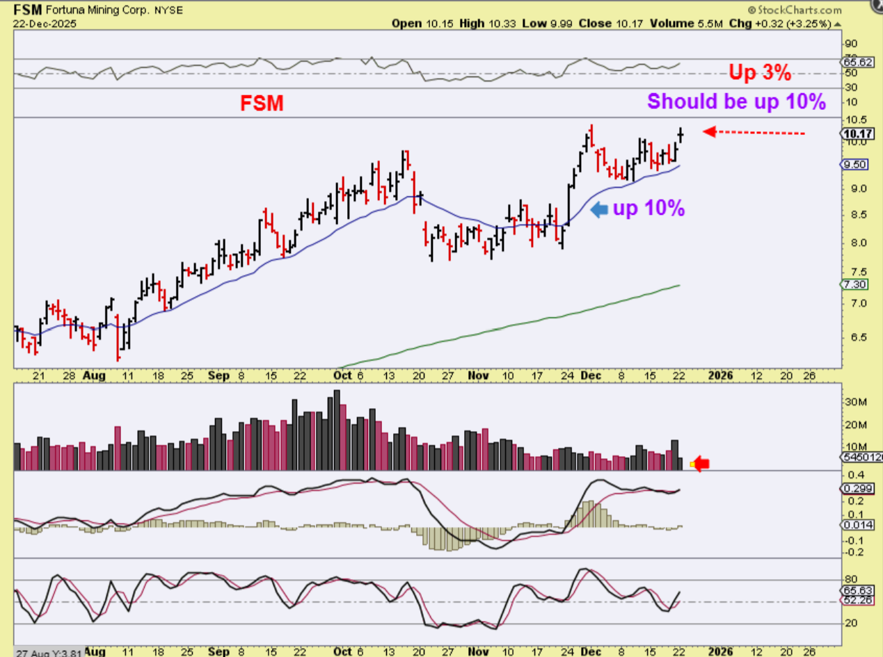 FSM gave us a doji of indecision? Up 3%. It had an ‘Up 10% day & solid rally in November, but as Silver rallied straight up, these formed cup handles.
