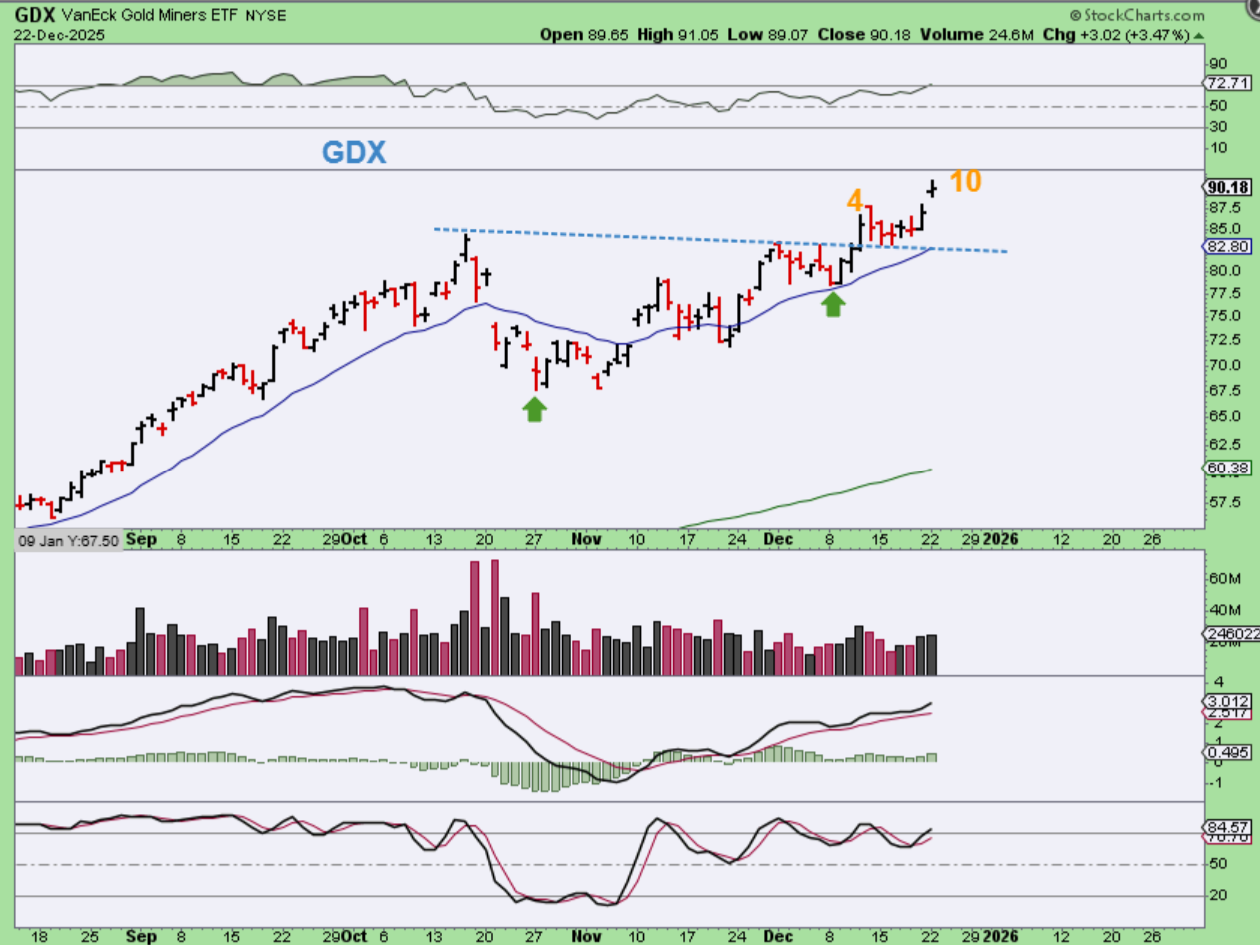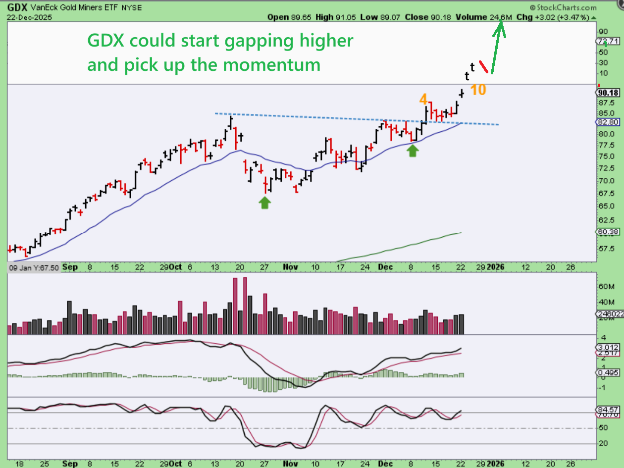 GDX looks to be on day 10 and it gapped up, ran higher, and then sold off. The gap may or may not need to fill. This is bullish and it is a choppy path higher. It could do this…