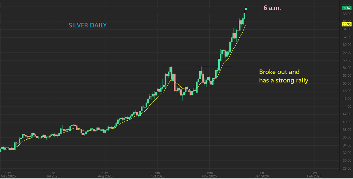 SILVER is simply on a tear! It has been ripping higher relentlessly. This is as of 6 am Tuesday morning, so Silver is up again. Normally if Silver broke out and ripped out of a cup like this, miners would be doing the same, locking in 10% gains in a single day…