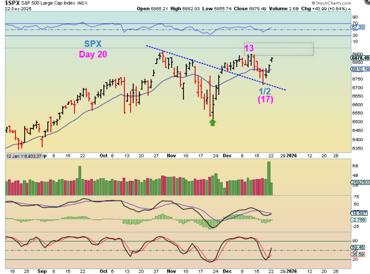 SPX – After being pressed down into a half cycle low, The Markets picked up where they left off on Friday, which was in rally mode. That half cycle low was on day 17 and since many stocks rallied sharply out of the ICL, we could see the same here. The SPX is almost back at