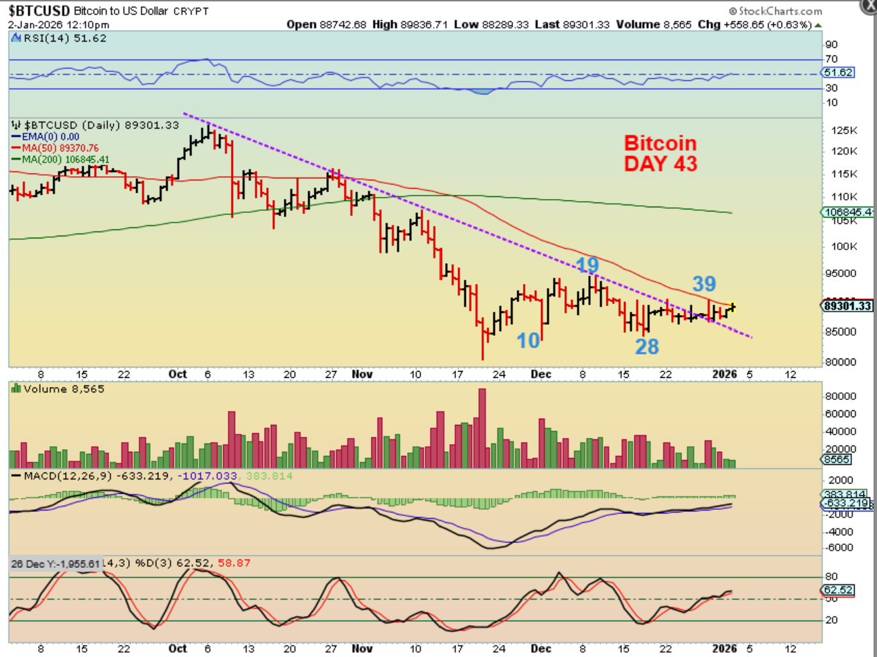 BITCOIN is now on day 43 out of the lowest recent low, but it is pushing on that 50sma. It is possible for it to make a quick run to the 200sma, but time is running out and it has been weak after that November sell off. We are in the 4th year of the 4 year cycle, and that is a year of weakness and resets.