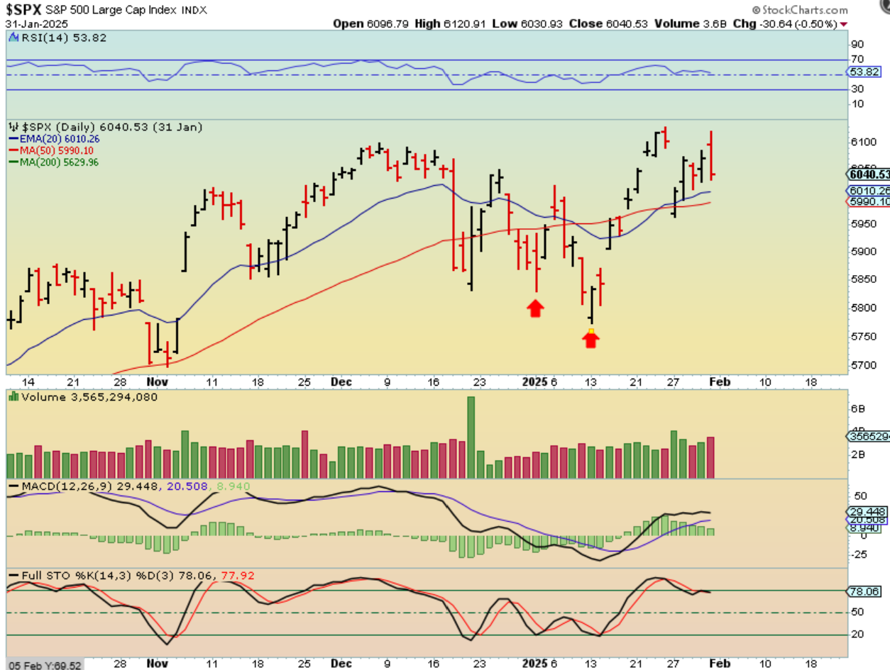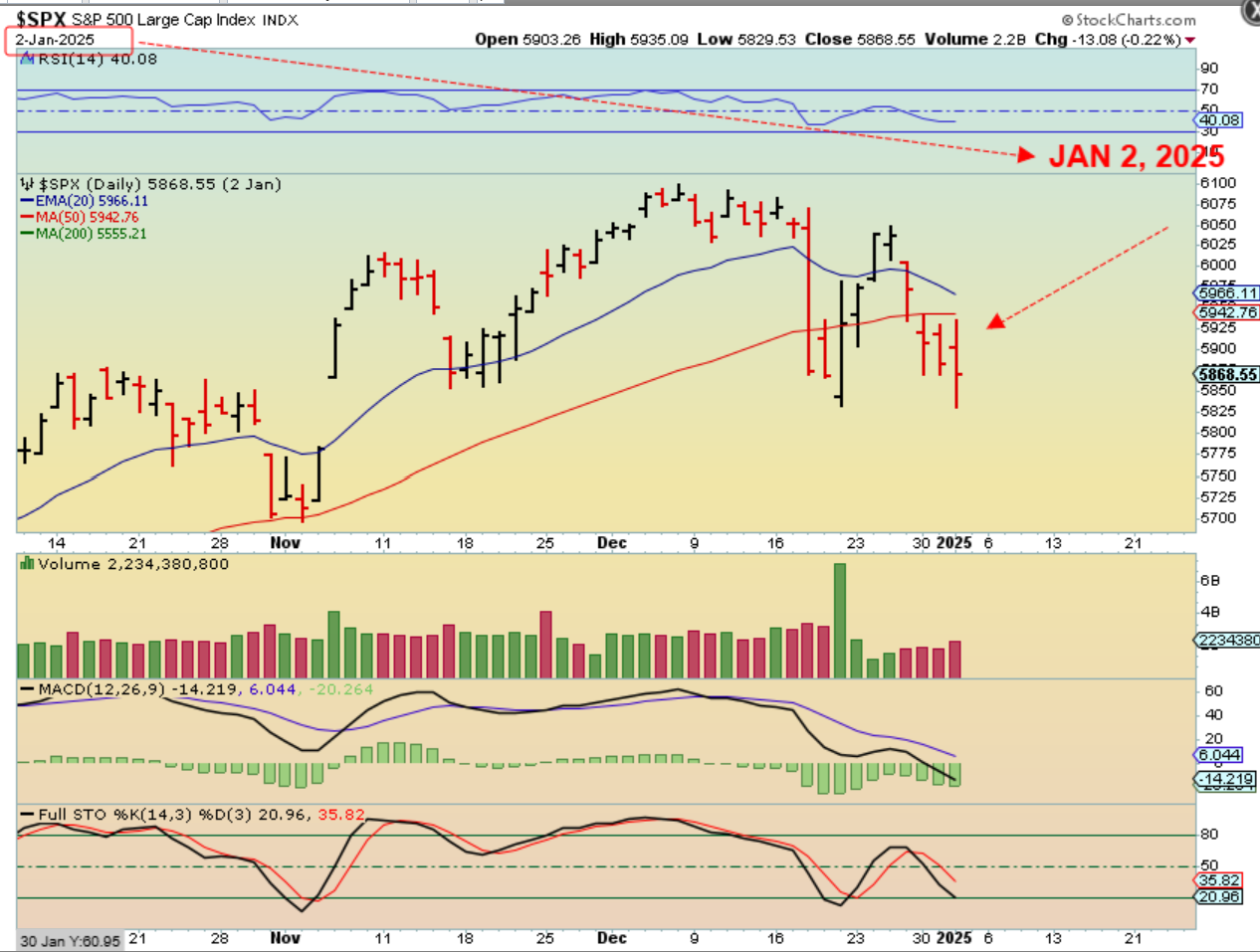 THE SPX actually dropped sharply at the end of 2024. That ‘Santa rally’ died on Dec 16th. It bounced into Christmas (Dec 25) and then sold off sharply heading into the end of the year. It then dropped on January 2. What happened next?…