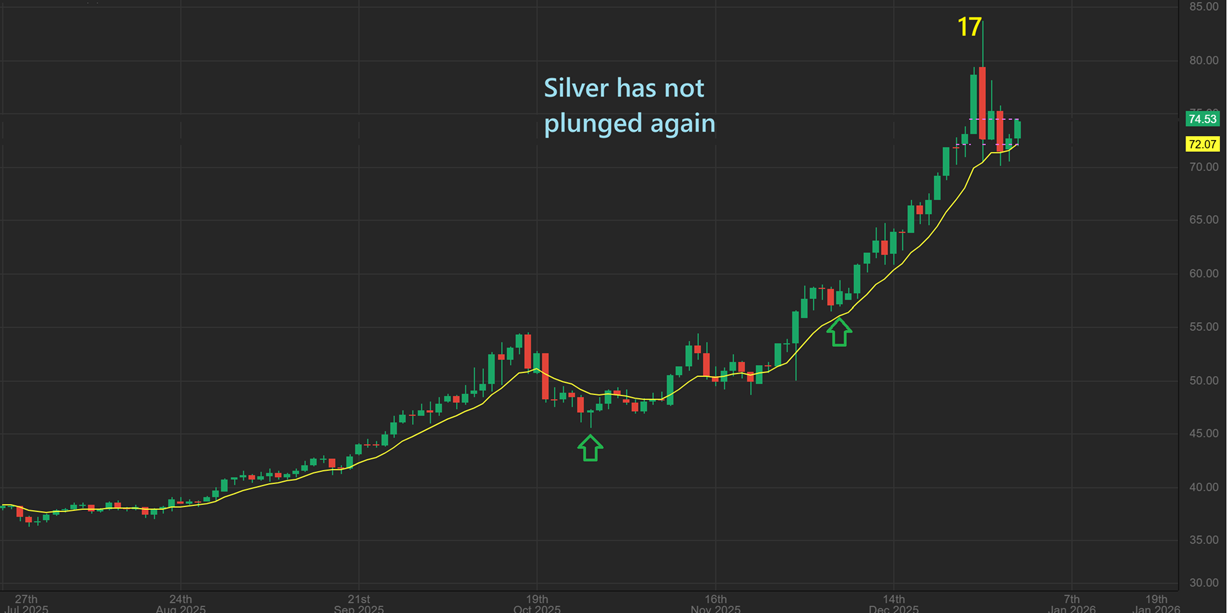 SILVER put in that large outside day candle, and that is usually a sign of a top and a reversal of trend. So far, Silver has not ‘Plunged’ below the supportive moving average (this is the 13 sma). This live shot shows that Silver reversed at the 13sma and is moving higher.