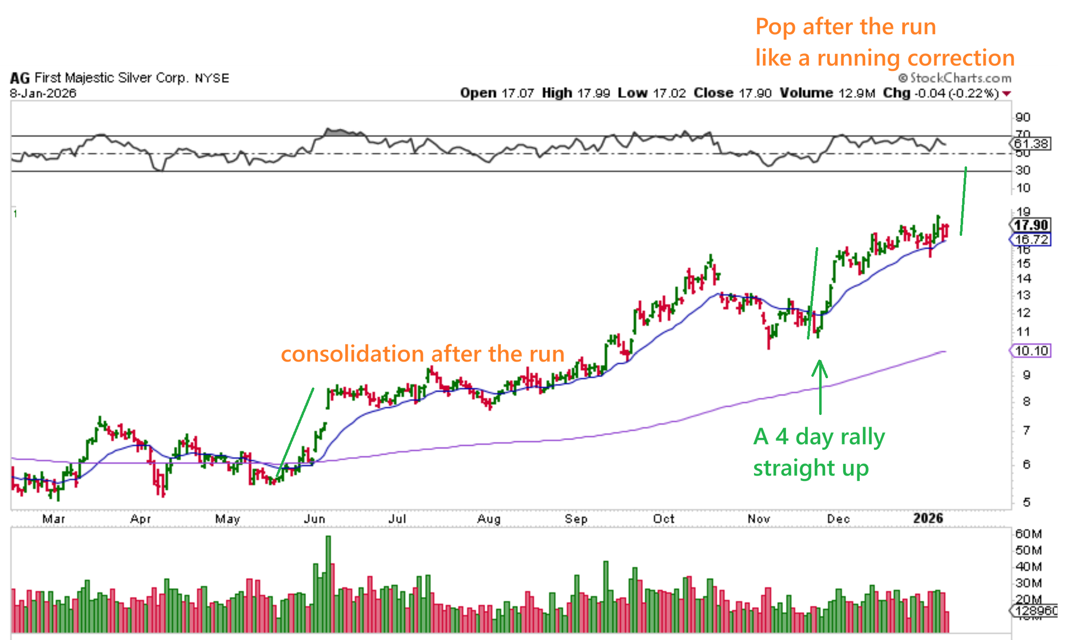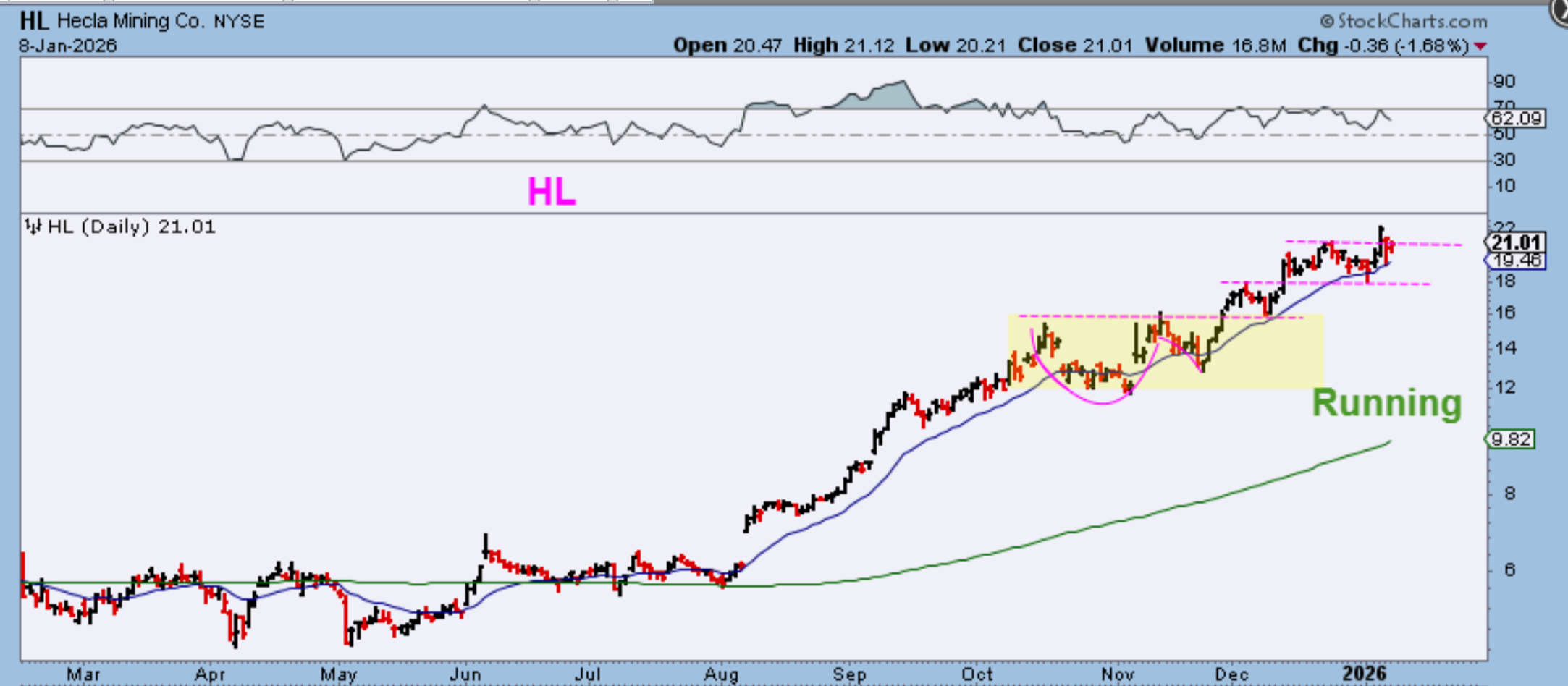 HL formed a small cup and deep handle consolidation in October through November, but then it chopped higher at a stronger pace than many others. In April through August HL was choppy and frustrating, right? Buy & Hold of HL since just August at the 200sma is now a triple plus! HL followed Silver.
