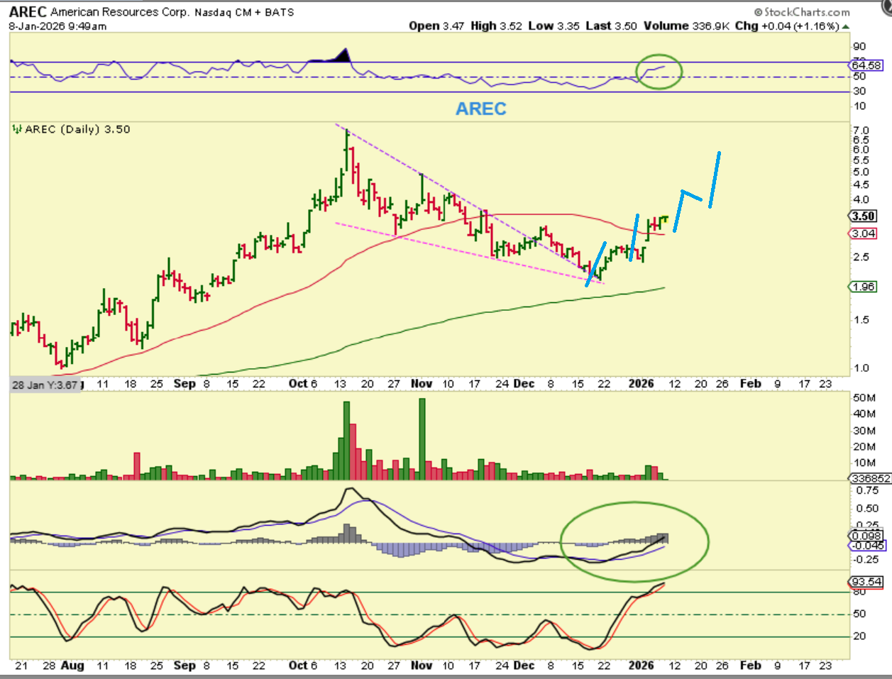 AREC moved out of the December low and has almost doubled $2-$4, but look at the rally from last year and you’ll see that this can run to $7, so it also became a buy and hold. It is above the 50sma now.