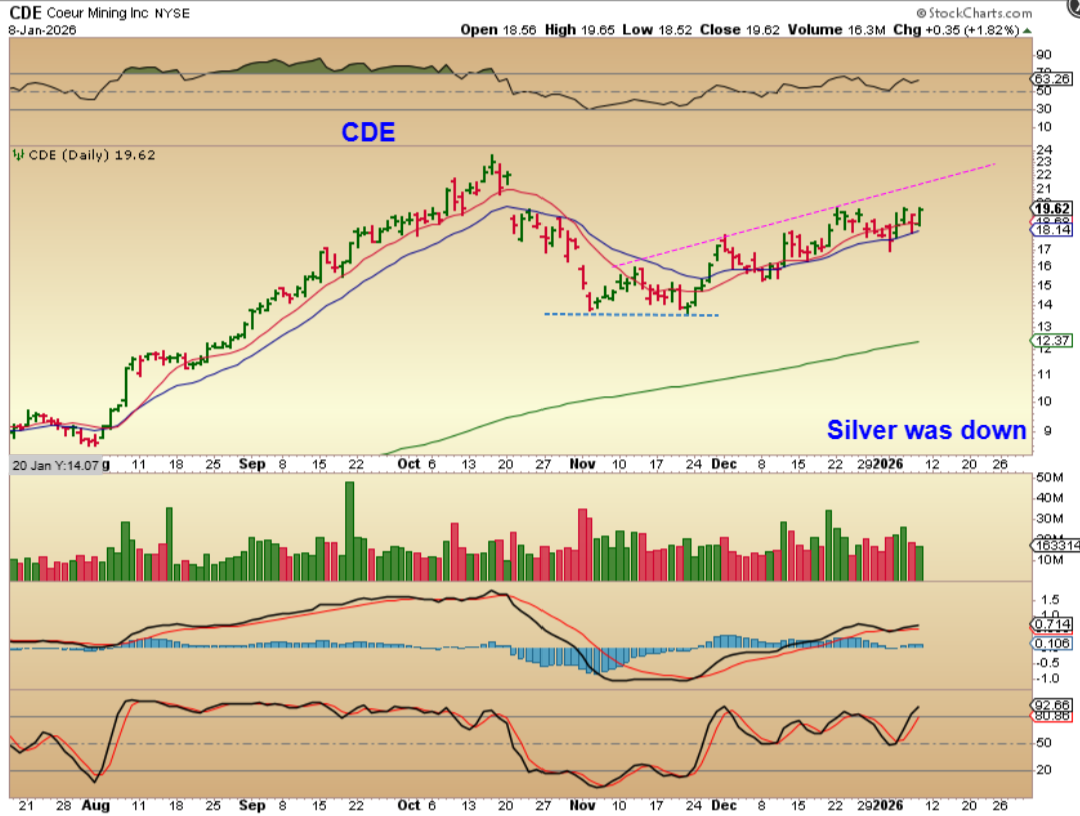 CDE rallied and went green with Silver down yesterday, and some others followed, so that shows buying. Some of the Miners that did not follow Silvers strong burst higher are chopping higher now. Others like HL and now some of the 5-letter miner/explorers are acting nicely bullish. Let’s take a look at Hecla again.