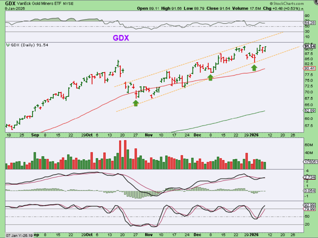 GDX is in a choppy channel that is sloped higher. Really, GDX is almost back at the highs. It seems to be that GDX started a 3rd daily cycle, which can be strong at the beginning, but then weakens later in the cycle. GDX is choppy yet progressing.