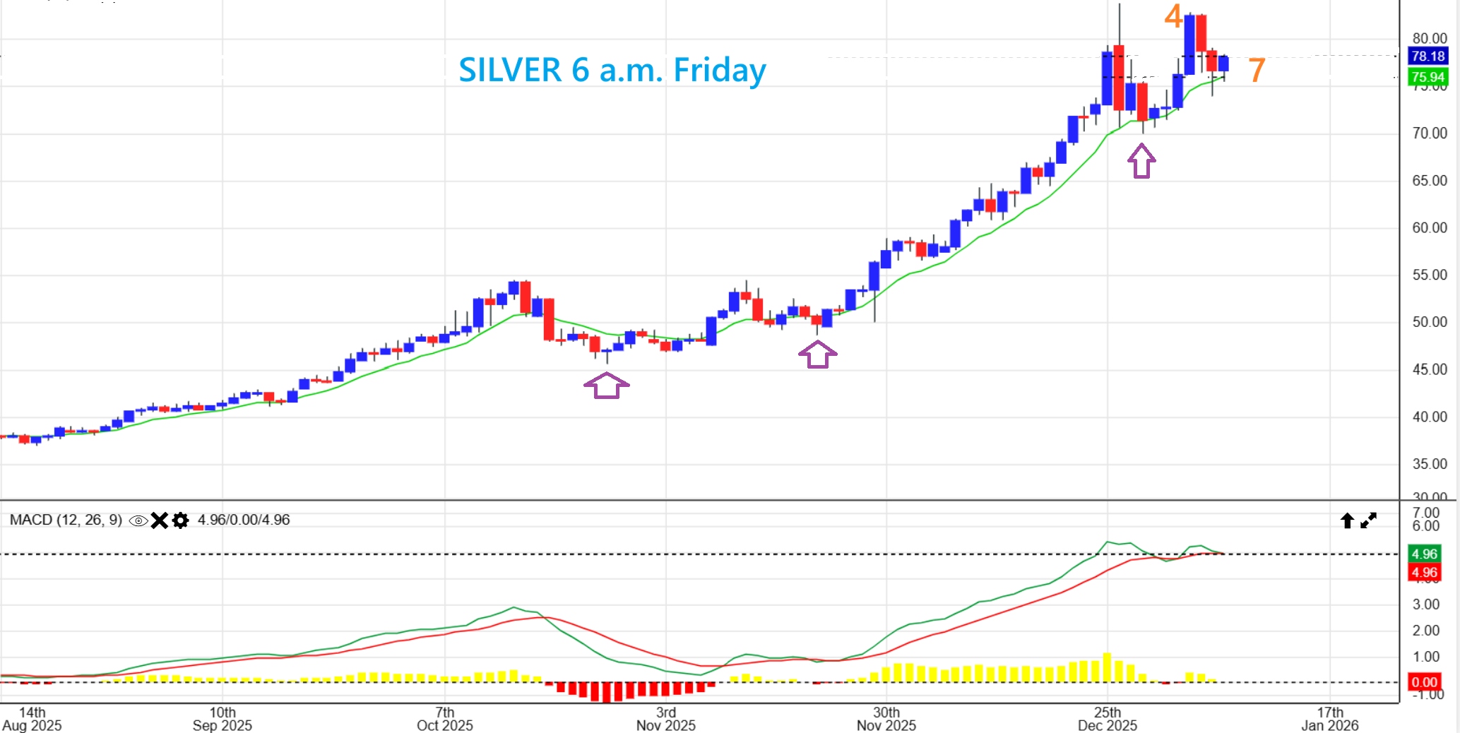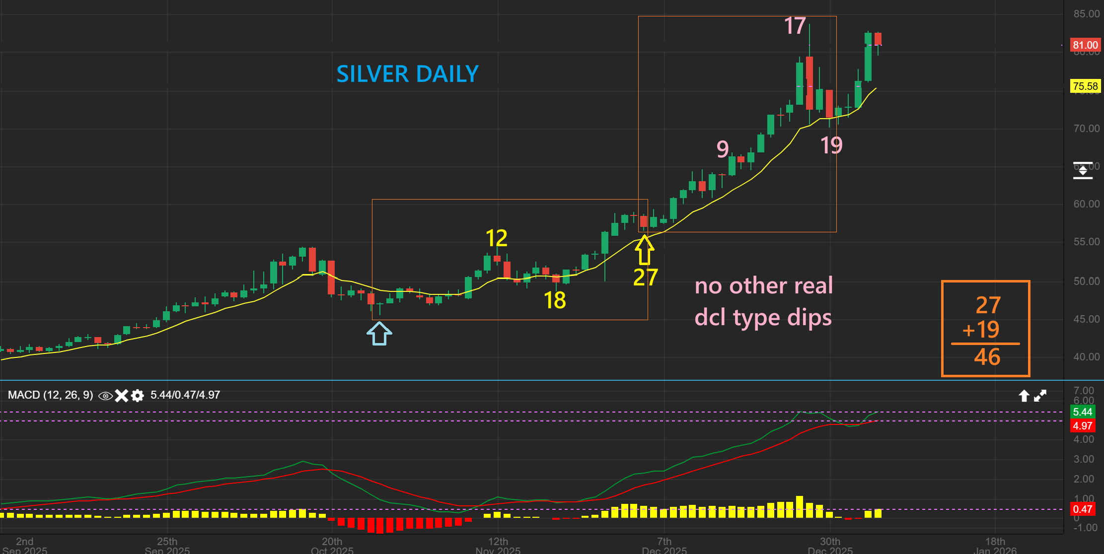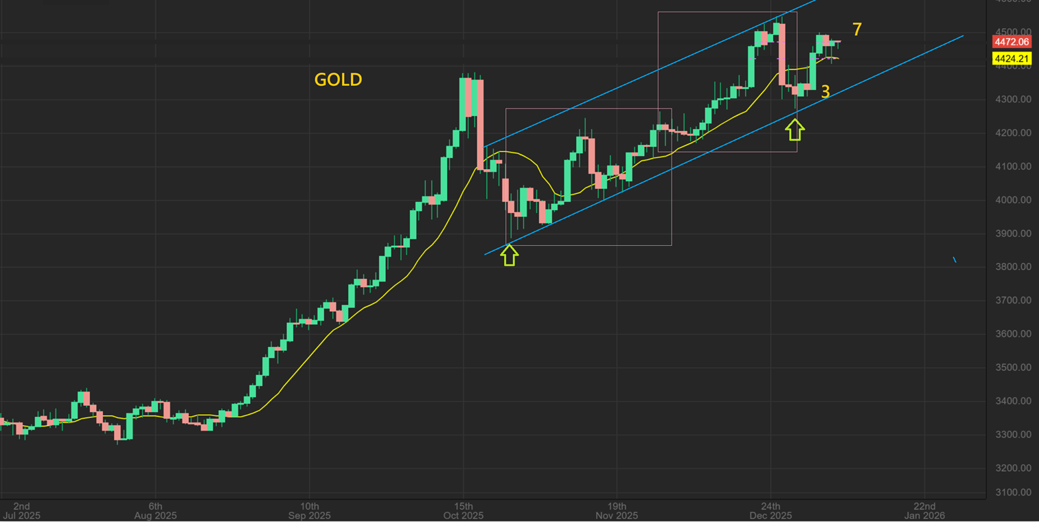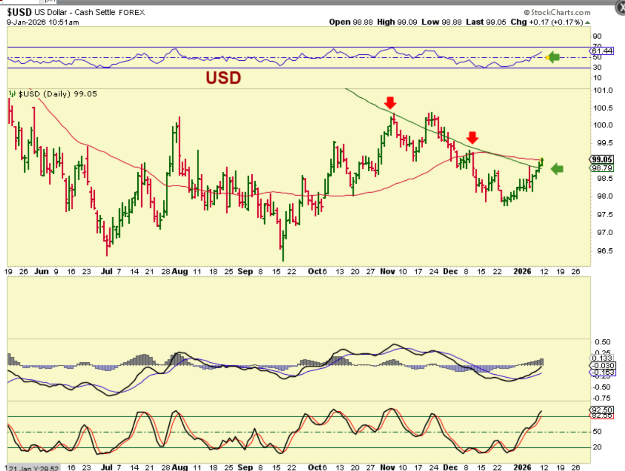 The USD actually was able to get through the 200sma and is now right at the 50sma, so the USD showed signs of strength in the MACD and with the higher low, and now we are seeing follow through strength. HOW WILL THIS AFFEC T PRECIOUS METALS? So far, the USD has moved higher for many days since Dec 22. Gold and Silver dropped, recovered, and dropped.