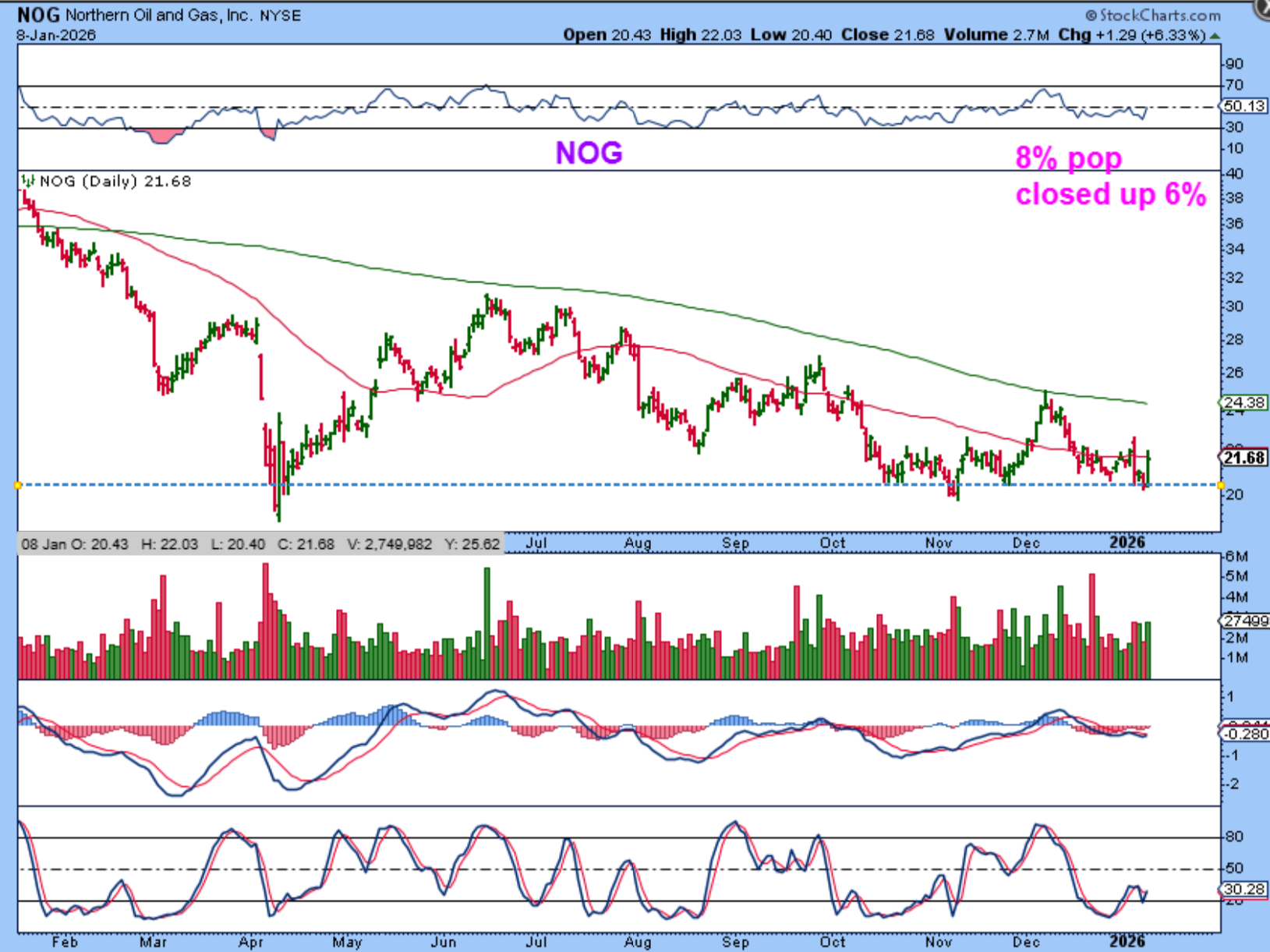I used to trade NOG when oil was healthy. It sold off with Oil and seems to be putting in a base or lows. It has been in a downtrend, but IF Oil can get above the 50sma, this should follow.
