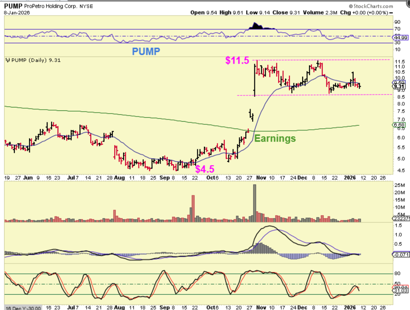 PUMP: This is also a company that I used to trade. ProPetro Holding Corp. is an oilfield services company that engages in the provision of hydraulic fracturing and other complementary services. They had earnings in late October and it shot up quickly. It is now consolidating gains.