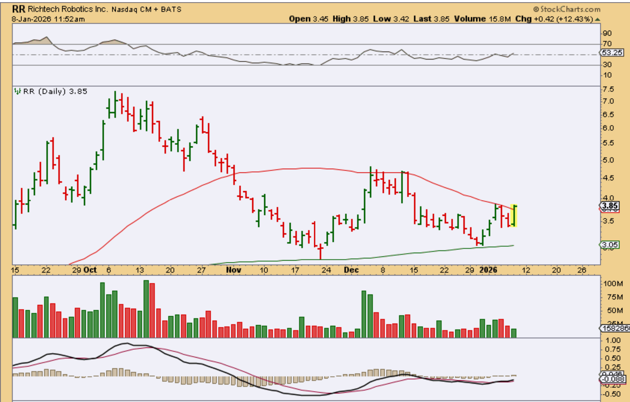 RR pushed through the 50sma, so I grabbed this chart when it shot straight up in the late morning. It closed up 15%. Drone stocks, Robotics and Aviation seem to really be doing well.