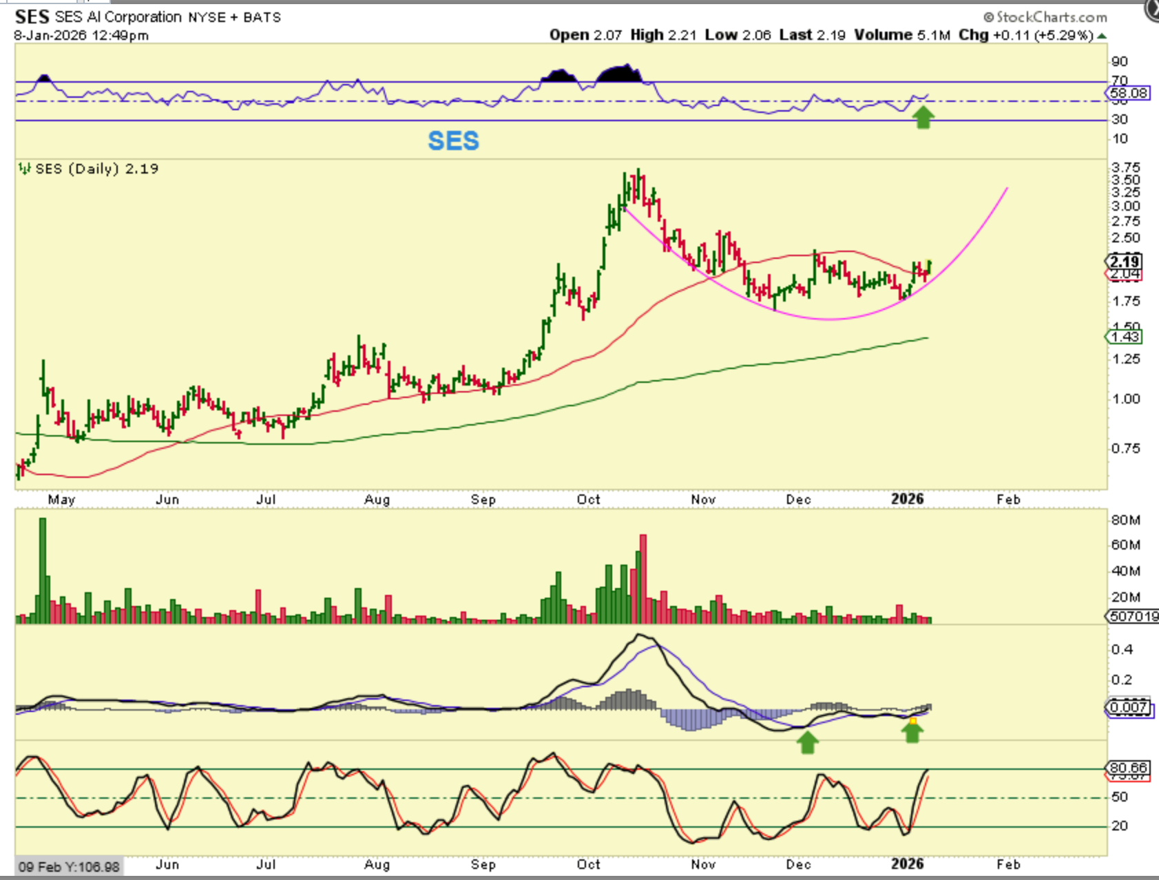 AI stock SES looked like a double bottom with divergence to me. Now it looks to be forming a cup and I traded this in September and October and I wish that I had just held it as a buy and hold. It ran from roughly $1 to almost $4 rather quickly. Could it do that again? It could.