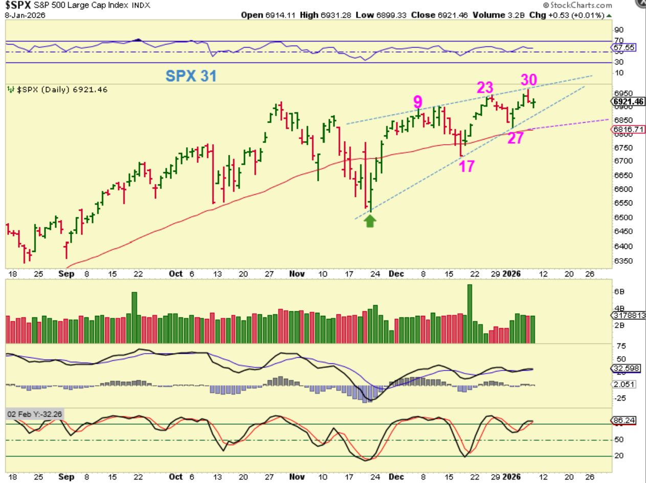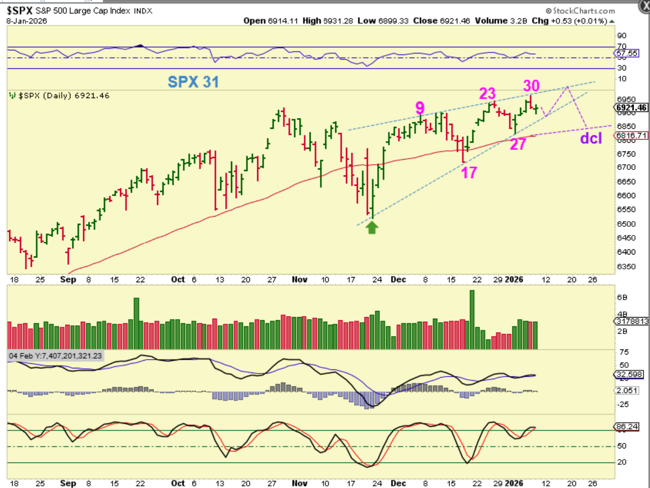 SPX – I just want to point out what looks to be a bearish rising wedge that I see developing. It is nothing to be too concerned about, since the SOXX and IWM do not have anything close to one forming. We know that a dcl will come due and the dip should become a normal by the dip opportunity.