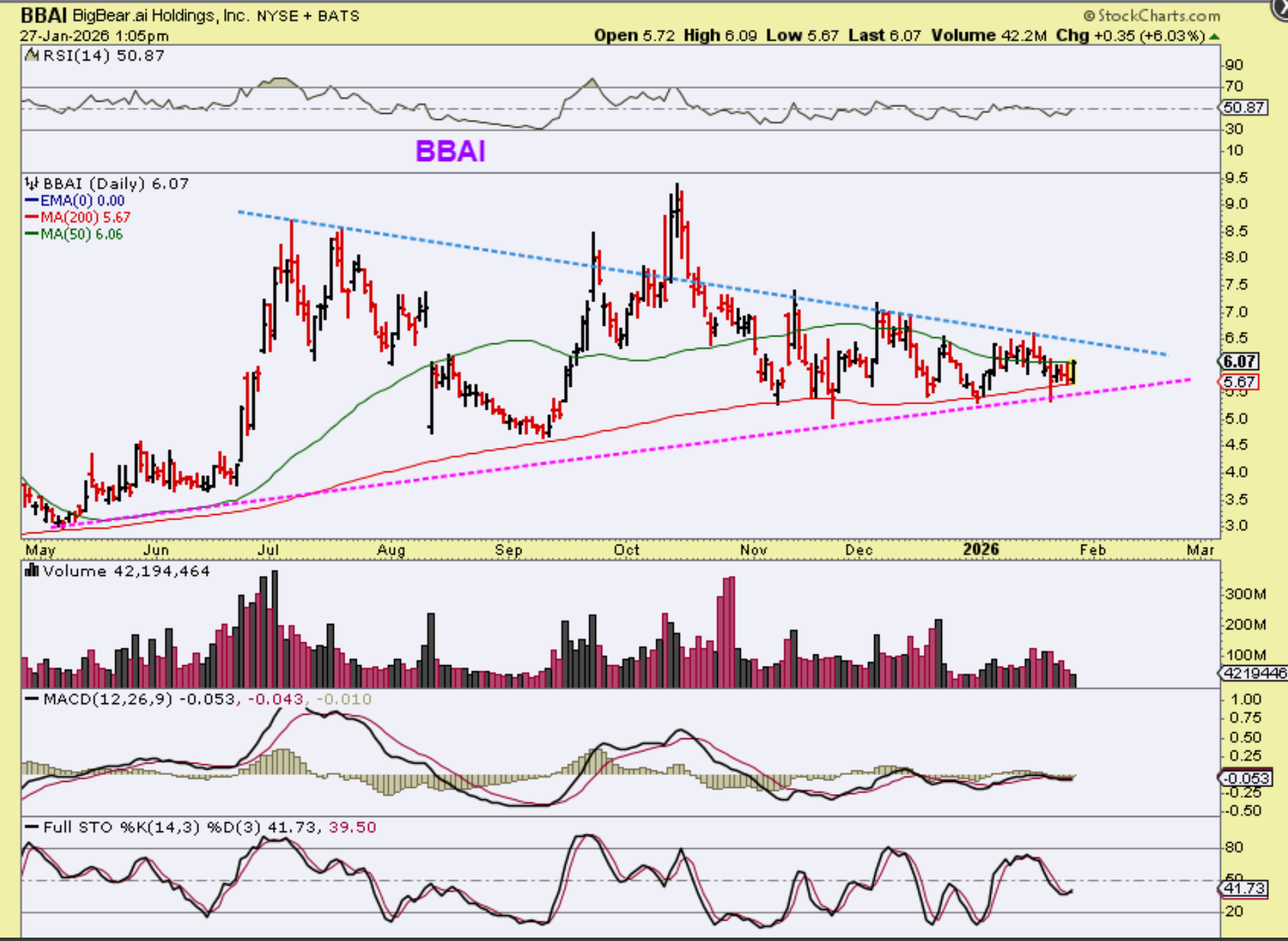 I pointed out BBAI midday on Tuesday. It reversed on the 50sma and is inside of a large triangle consolidation. It is a bullish set up at this point.