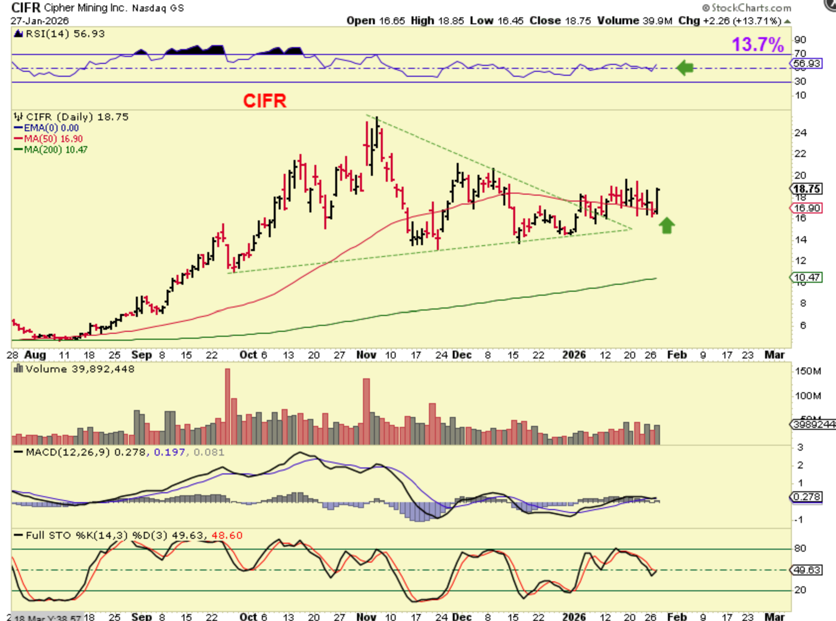 CIFR is above the 50sma and moved up almost 14%. That is a big move on a day when Bitcoin hardly moved, and that is not the only one, as mentioned above. This sector may lead to some good short term trades.