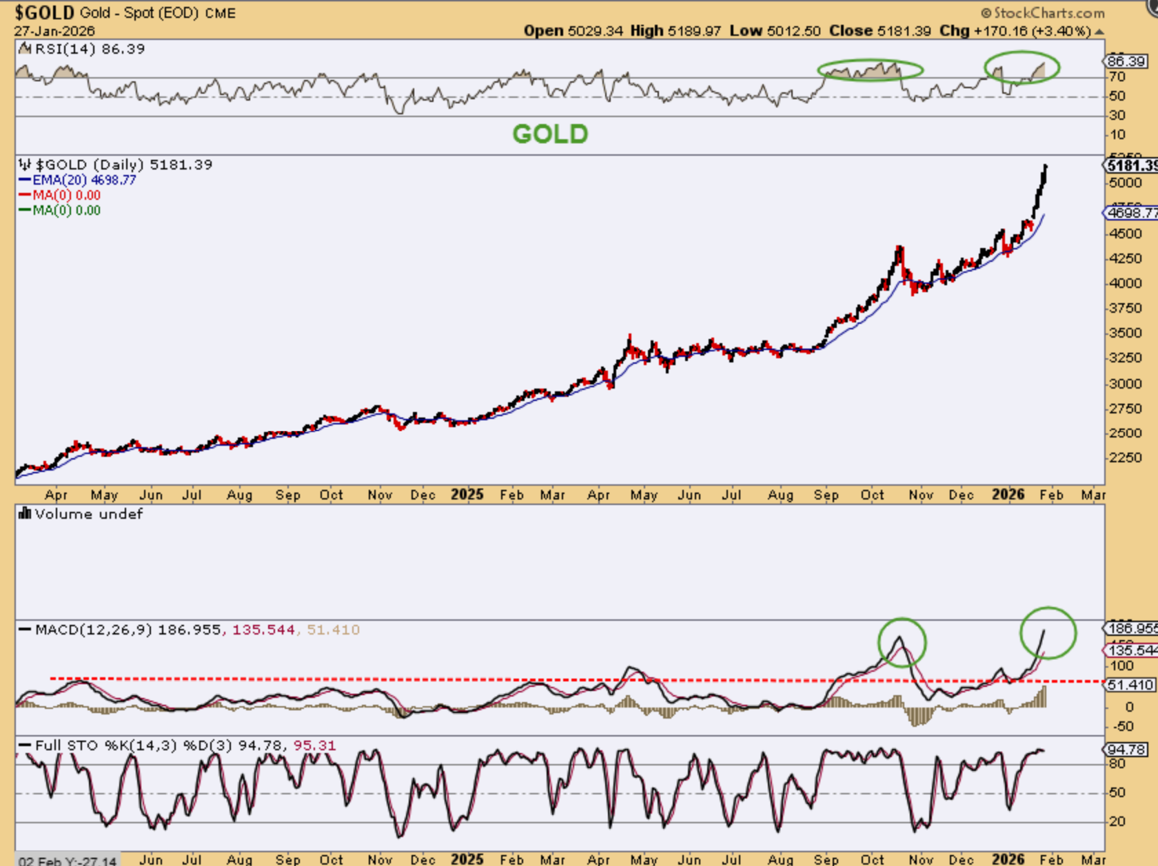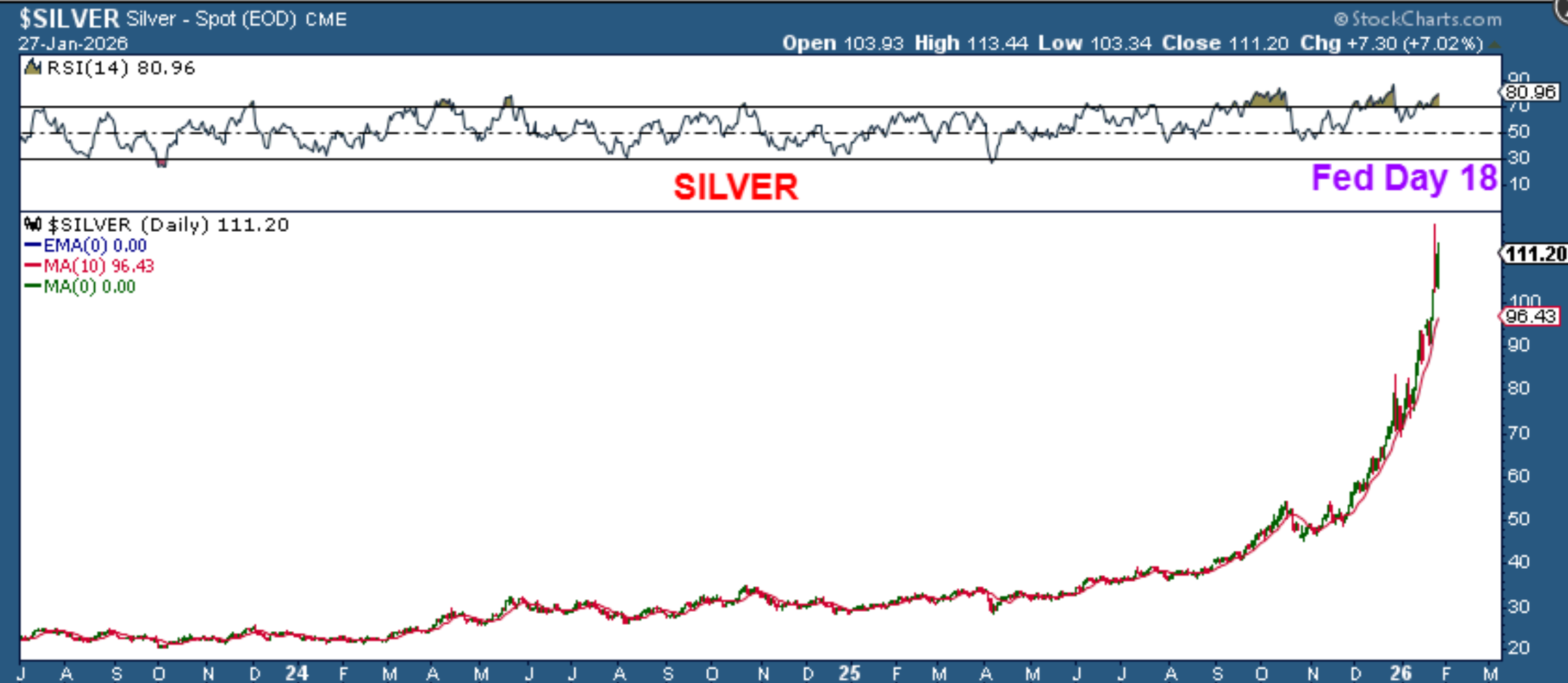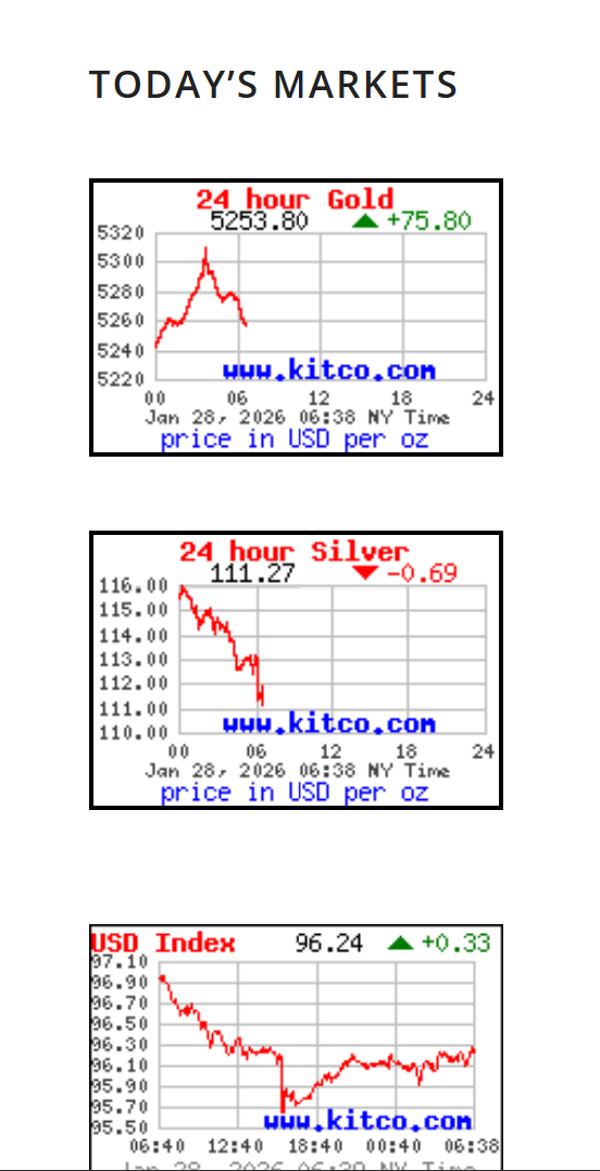 The above report was written on Tuesday evening. Today is the first F.O.M.C. Meeting of 2026, and since we did get a rate cut last December, it is expected that we will not see any change today. What is discussed in the Fed Meeting from 2:30 p.m. ET onward is what could be a market mover.  Gold was up over $115 last night, over $5300! Silver was up about $4 and it was at $116, but they’ve started to sell off from those highs.
