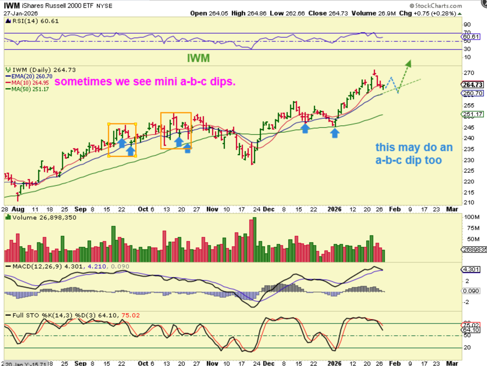 IWM – I often see a dip, small bounce, and a dip again (a-b-c), so I drew one in here simply because we have a Fed Mtg on Wednesday and this is the kind of thing that could happen. Volatility. Price also may just rally higher out of this dip as a mild dcl, we just don’t know yet with the Fed ahead.