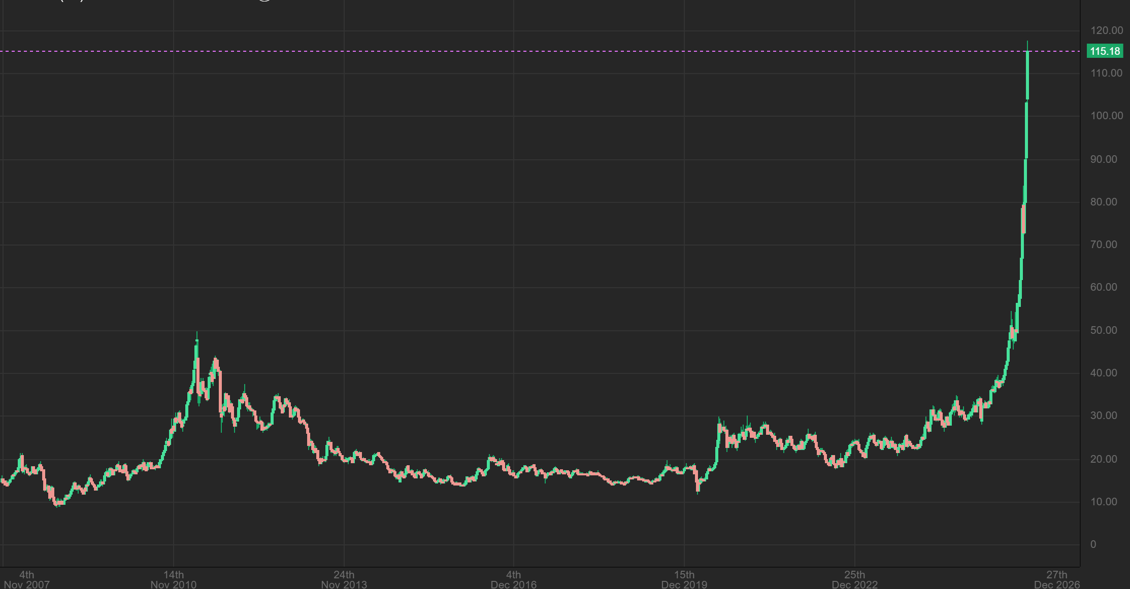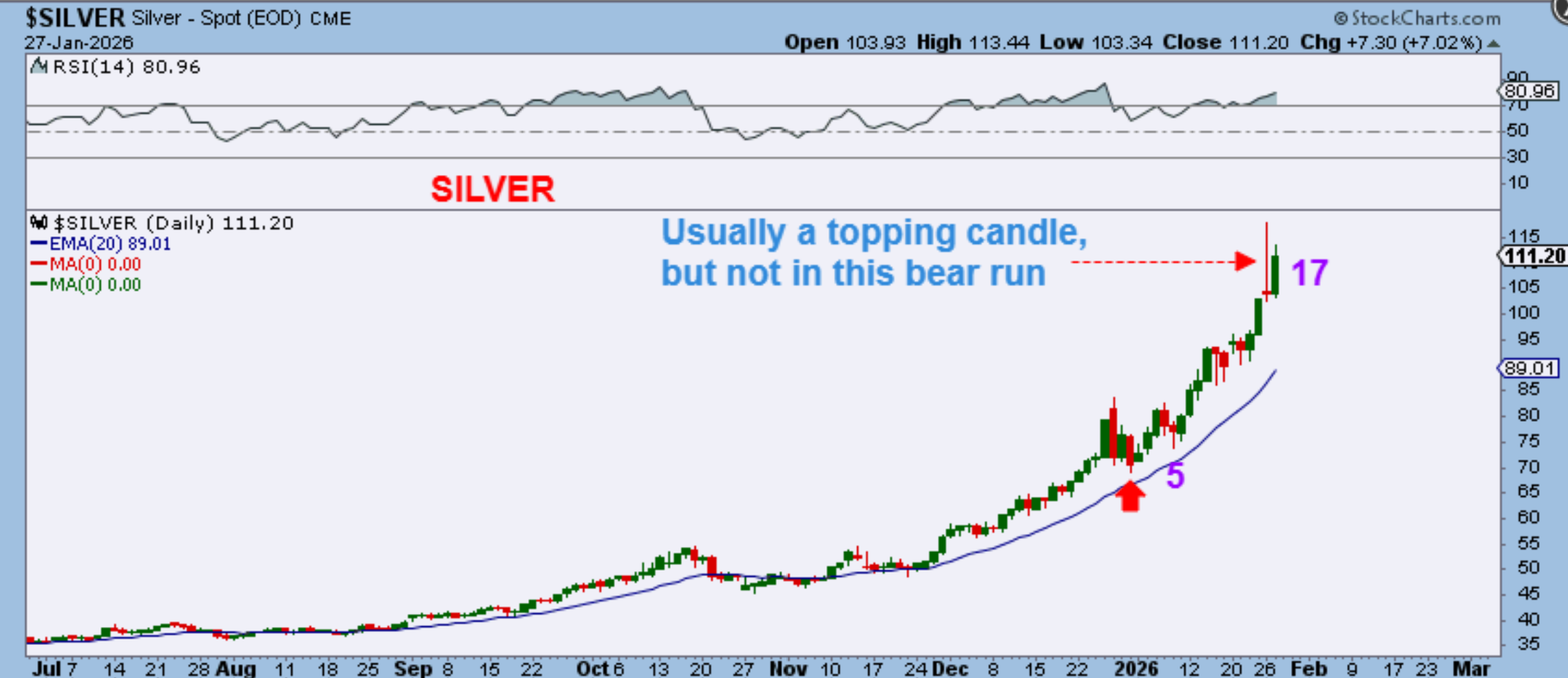 SILVER – This is still a daily chart but you can see the arch of the parabolic climb higher. Coming out of the October dip I thought that it could reach $80 and there was a $97 target area, but this blows that away with Silver going over $117!  Remember when Silver was $11 last year? Wow!   Do you want to see the weekly now?? 🙂