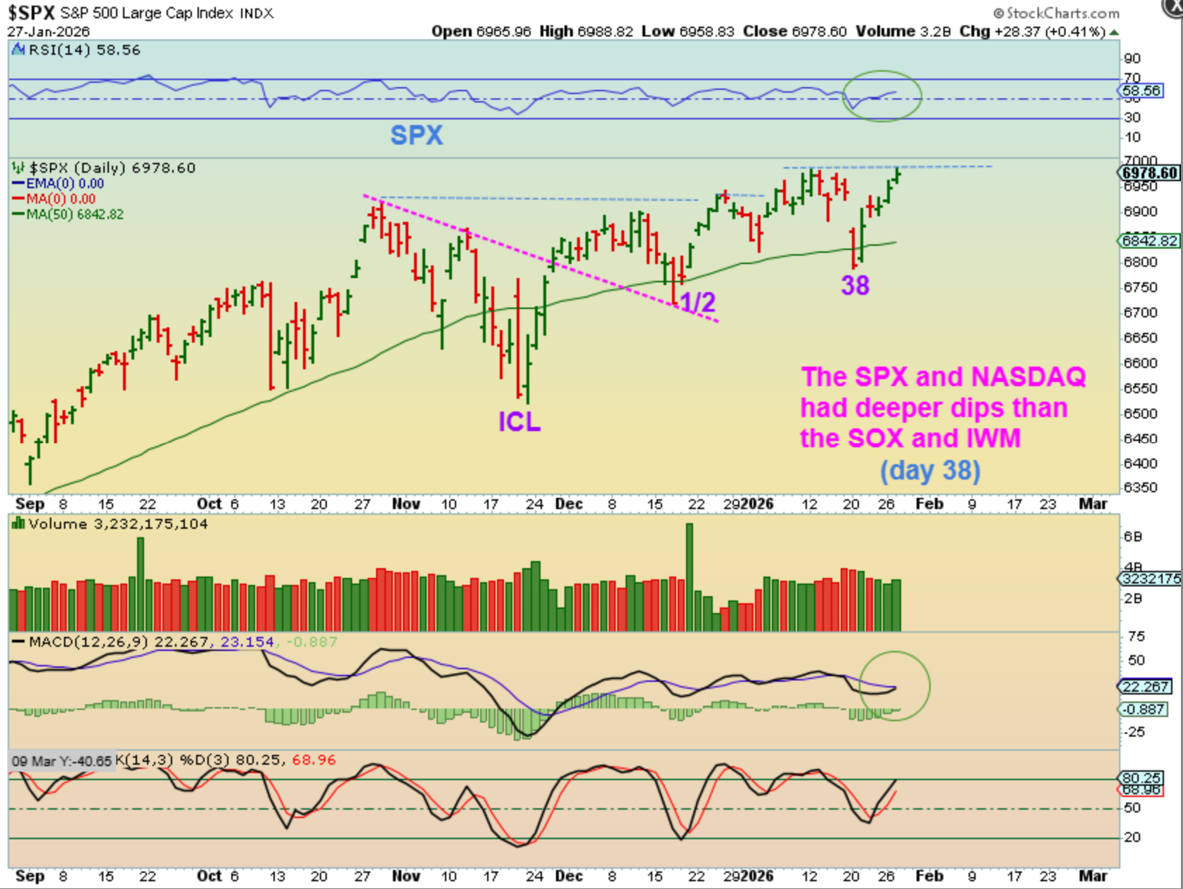 1. Look at the drop of the SPX & NASDAQ 6 days ago on day 38. THEY BROKE BELOW THE 50SMA. We saw a shakeout and that now looks like the day 38 dcl.