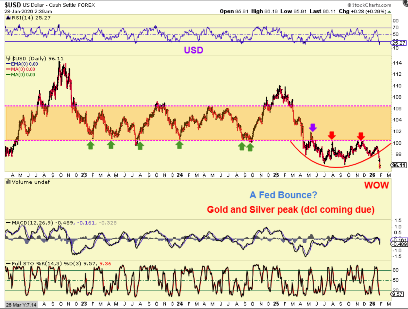 THE USD has plunged to new multiyear lows. Heading into the Fed Mtg the USD dropped sharply and Gold and Silver went straight up. That makes me think that we are going to see reversals this week. Please see the chart below.