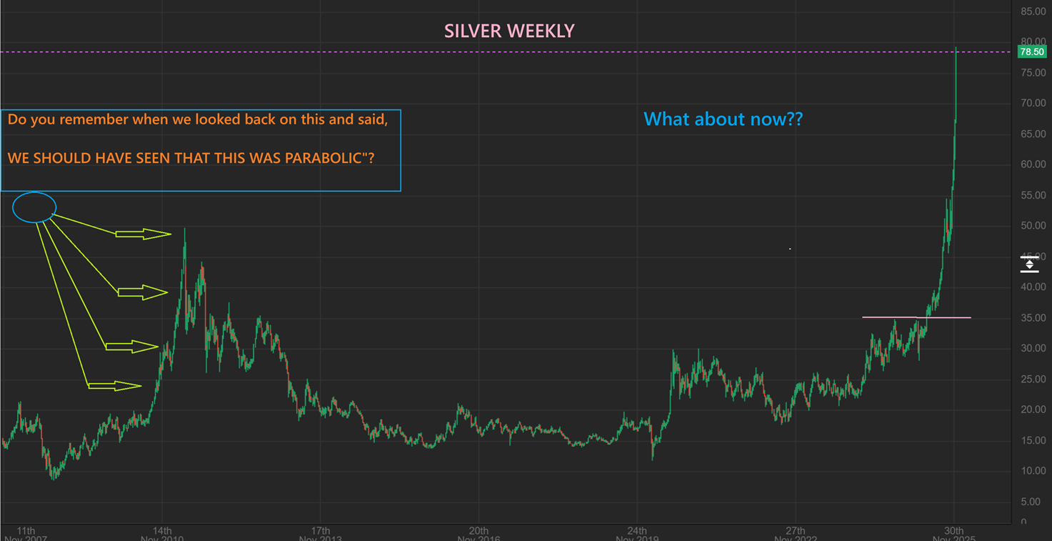 THE USD: The big picture for the Dollar is that it lost support and has been unable to regain it. It WAS making lower lows in 2025, but with this rounding bottom forming I’m watching to see if it stabilizes and starts to form higher lows, possibly in preparation for a break back above $101. Also, would that match the current ‘peak’ in Silver?