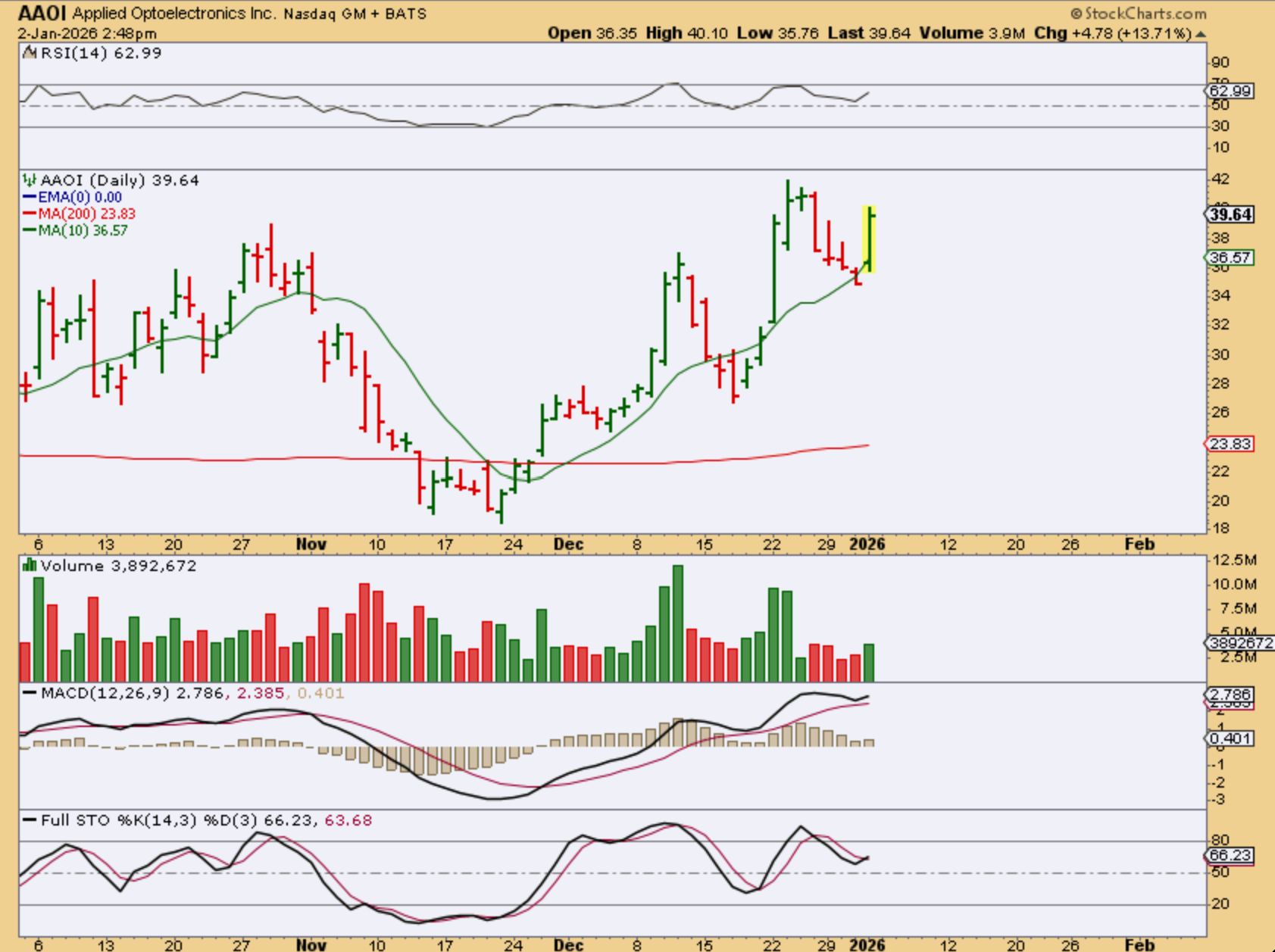 AAOI – Not an easy ride, since it does make very large swings, but AAOI has already doubled out of that November ICL low. And again, it was up 14% on Friday, when the Nasdaq was Red.