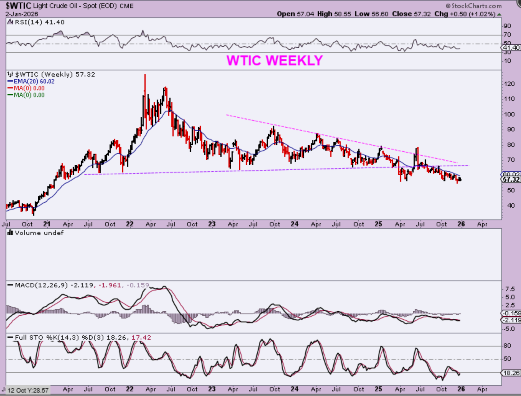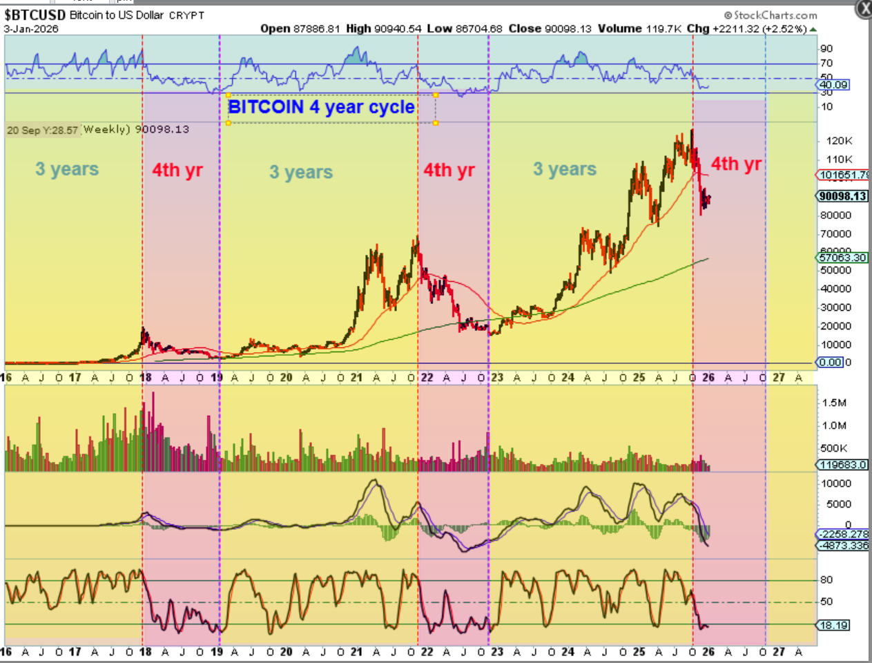 In 2022, take note of the blue arrow. That is why I expected a bounce here, to the 50 week ma (red line). That time period in 2022 was similar to the current set up, and it did bounce to the red line then. So I will draw that bounce in now, but we may run out of time. This kind of looks like a bear flag now. I have been expecting 2026 to be a 4th year drop and consolidation period, until maybe the October time period. And then…