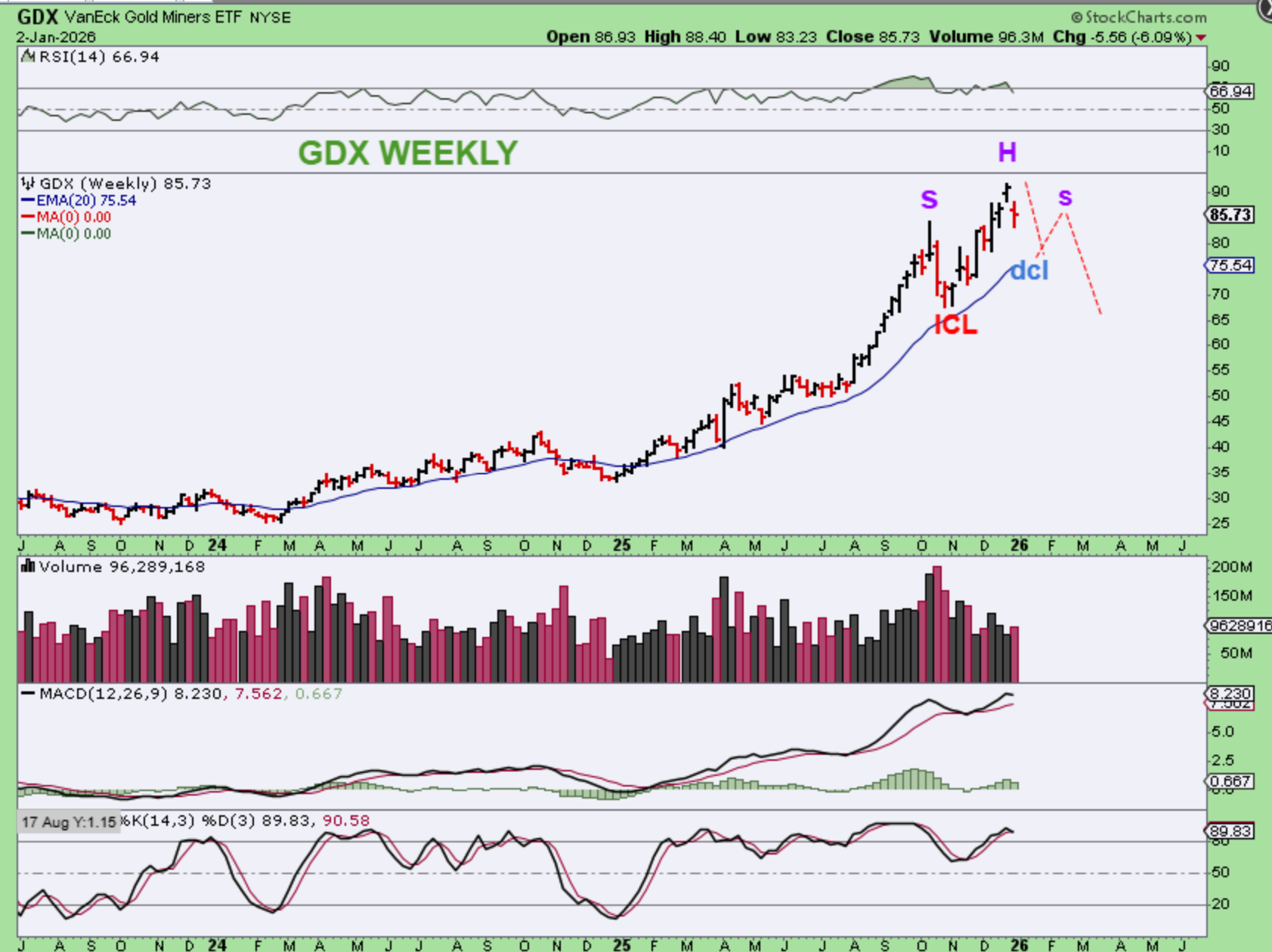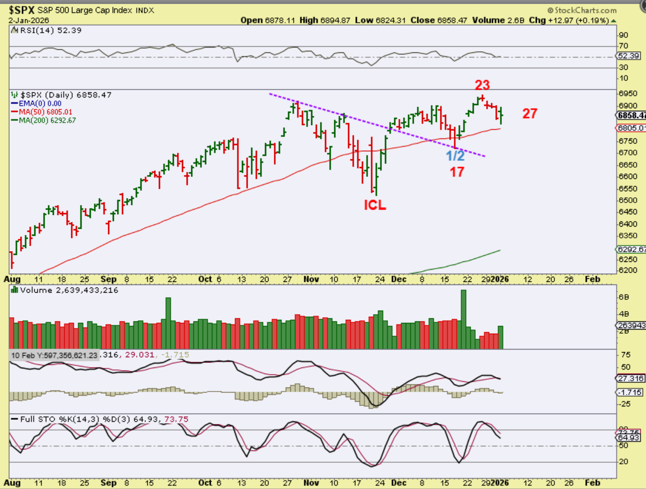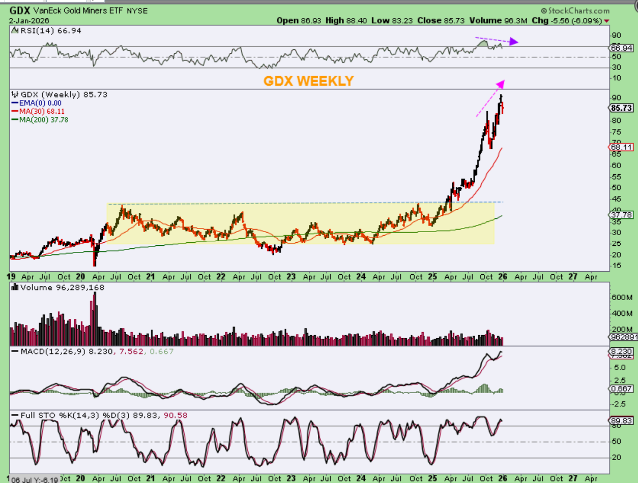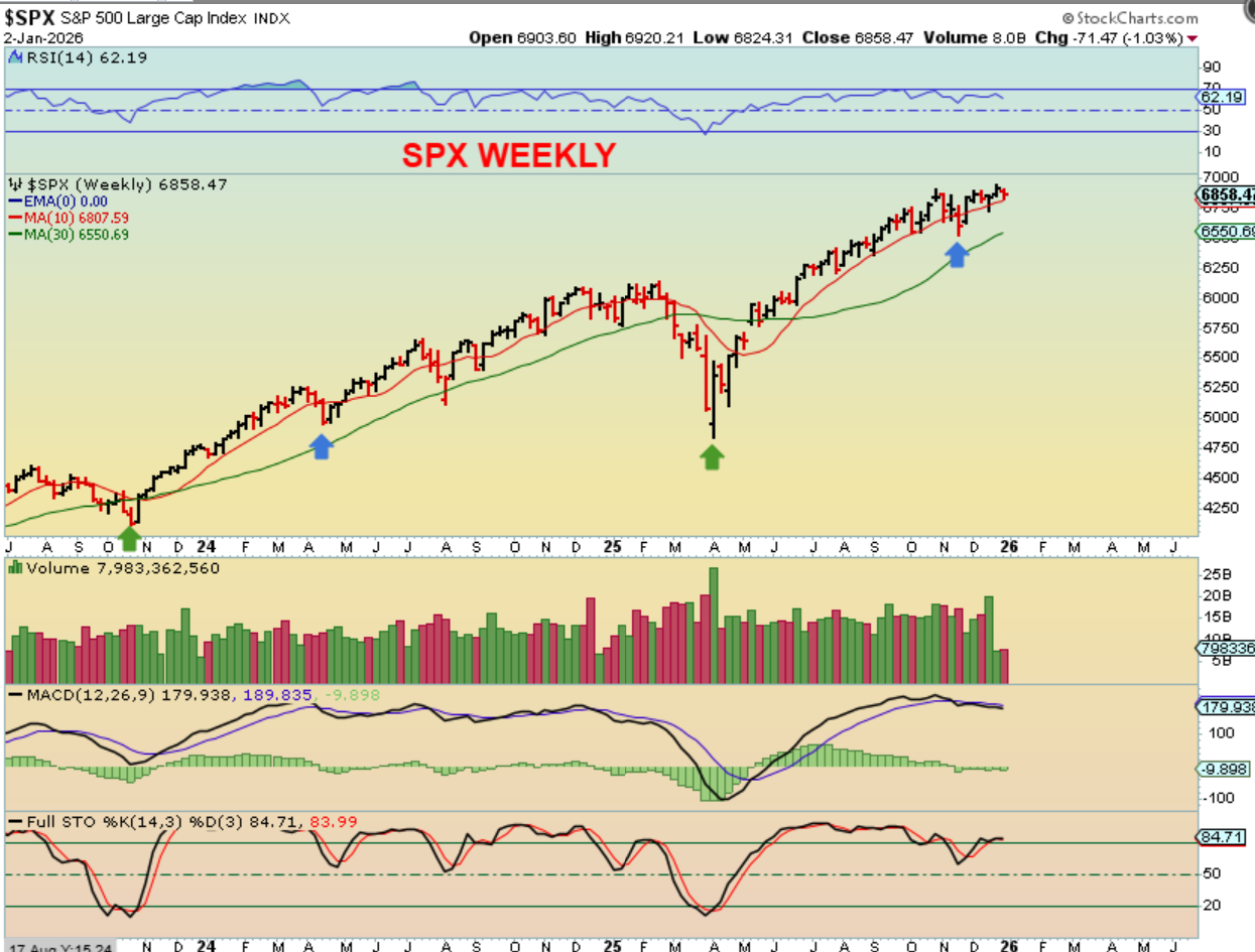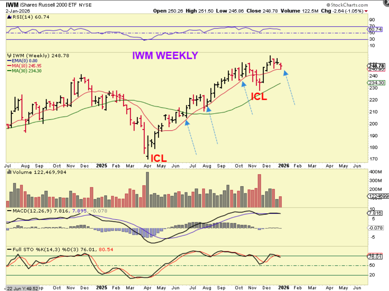 What a strong year the bulls had in the General Markets and Precious Metals in 2025, and for Crypto in most of the year too! I think that we have our peak in Crypto due to the 4 year cycle, but a nice buy could show up in the second half of the year, I’m guessing maybe October? Big money can be made in Crypto from that point on. The Precious Metals seem to be peaking in a parabolic run, and they would need to consolidate recent gains too. What about the General Markets? The General Markets may be seeing some rotation, where some leaders consolidate and rest for a while, and other sectors that already pulled back into the recent ICL may begin to take over and rally. Time will tell, but on Friday many stocks were up 10%plus, with some leaders breaking down and the Nasdaq Down. I WILL POST MORE CHARTS BELOW, AFTER BITCOIN.