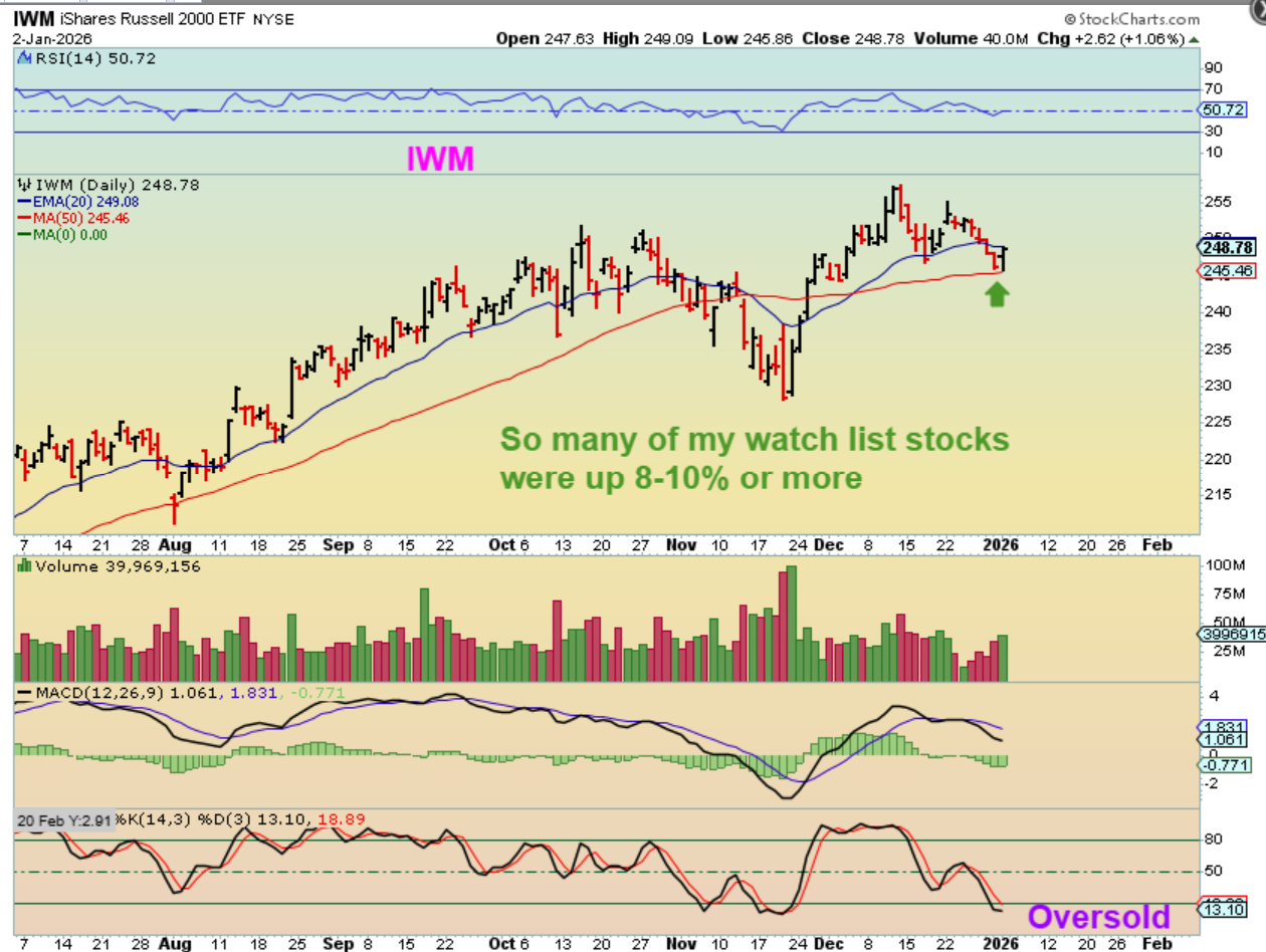 So the question is: WILL 2026 be a year to focus on small cap stocks and will big money start pushing these much higher (AI, Aviation, Quants, Software, Robotics, Rare Earth, etc), or is everything going to get choppy while the large caps consolidate and ull back? We’ll see, but on Friday, I made very good gains trading the stocks that we have focused on in 2025, with the SPX & NASDAQ down all morning. Let’s take a look at the charts and you’ll see exactly what I am talking about.
