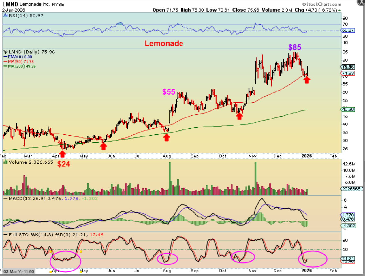 LMND is acting bullishly and correctly, but I have not mentioned LMND anymore in recent reports, because it was too choppy for me (As a trader, 3 months sideways is tricky). That said, it is a valid bullish stock that ran from $24 to $85 ICL to peak! …and notice how it closed up on Friday too, after reversing at the 50sma.