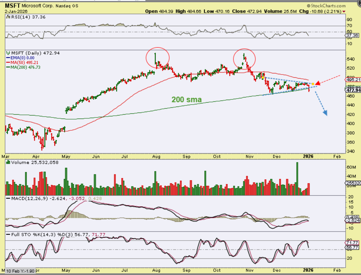 MSFT was a leader out of the ICL in April, but it has a double top and then it lost the 50sma in November. Friday it closed below the 200sma. That also looks like a continuation pattern after the drop from the second top, so I would expect more downside here. And…