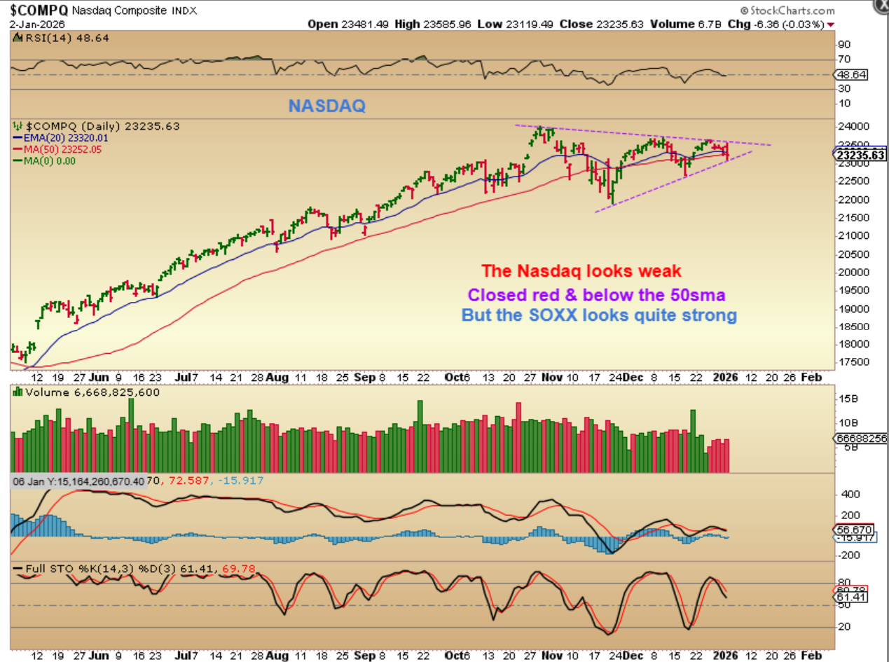 And then when we take a look at The Semiconductor ETF, THE SOXX. You can see that it also closed up strongly on a day when the NASDAQ was weighed down and red. The RSI 50 held up and the volume came in on a holiday week Friday. So we have a mixed bag, don’t we?…