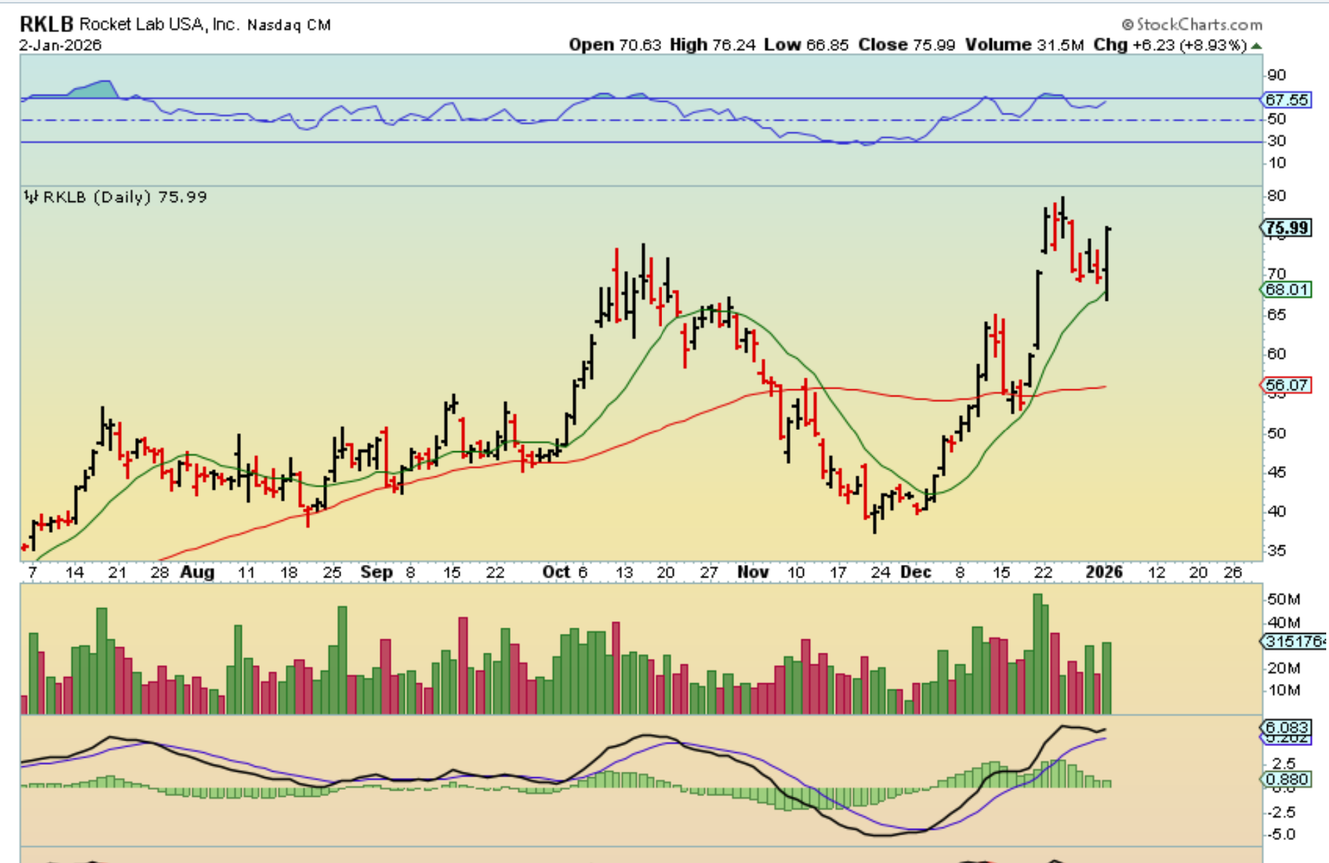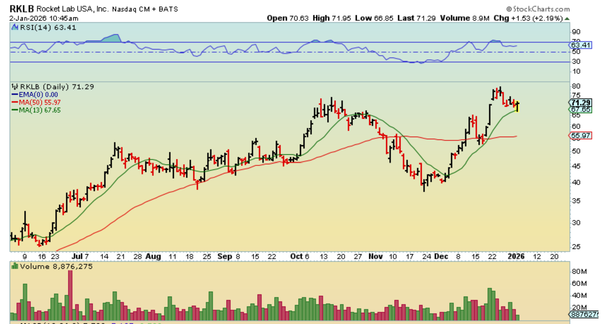 RKLB closed up at the highs of the day, up roughly 9%.