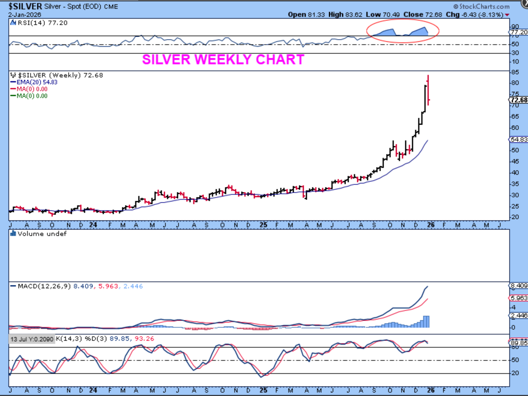 GOLD dropped 4.44% last week, and this was discussed in the daily reports. We should be only on a second daily cycle, so Gold should be able to show a little strength rather than continue to crash here, a drop to the blue 20 week ma is possible. When a dcl forms and it bounces in the 3rd or 4th daily cycle though, we may see that a long consolidation starts again in 2026.