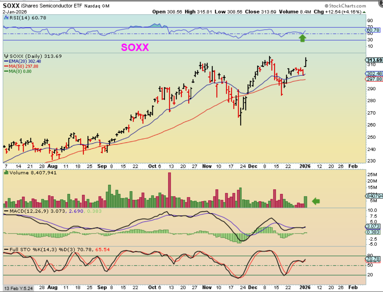 So we have a mixed bag, don’t we? At the end of this report I will post several more bullish stock charts that did well on Friday, and as we start the new year, we’ll be able to see if THESE will continue to make excellent gains while the famous 7 large caps take a break and consolidate? Or are those 7 large cap companies leading the markets lower and our small caps will start to weaken too? Time will tell. So far, Friday was a great day for the many stocks and sector on my/our watch lists.
