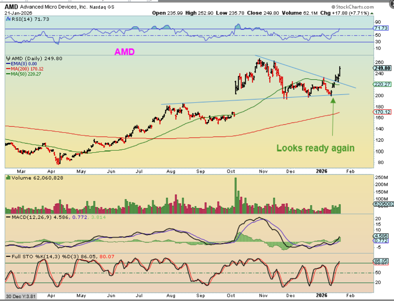 AMD has been consolidating that big burst higher that it had in October. When the markets dropped into the ICL for November, AMD chopped lower and lost the 50sma, but it looks ready to start running again, with 6 straight days higher.