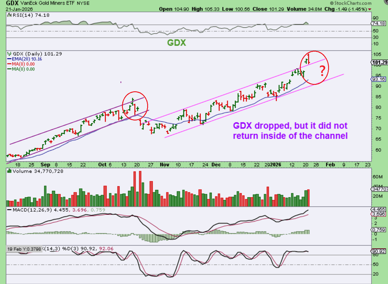 GDX– The Miners gapped open big with Gold up over $100, but they sold off with Gold and Silver into the end of the day. Many Miners were red during the day, even when Gold was up, so some selling did occur after the channel breakout. I’m watching that channel.
