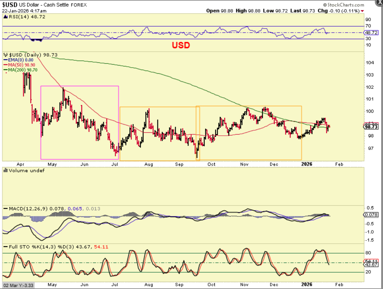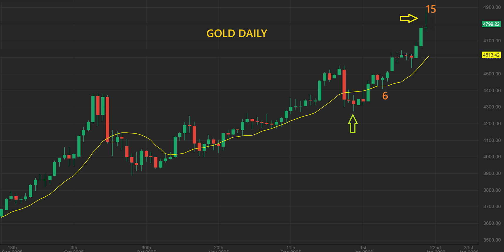 GOLD gave us a large rally on day 15 and then sold off after Trumps comments. This is often a topping candle, and it could lead to more selling, but what I have found with Bitcoin, Gold, and Silver is that since the price of Gold really doesn’t ‘close’ here, it can continue higher to that $5000 area.