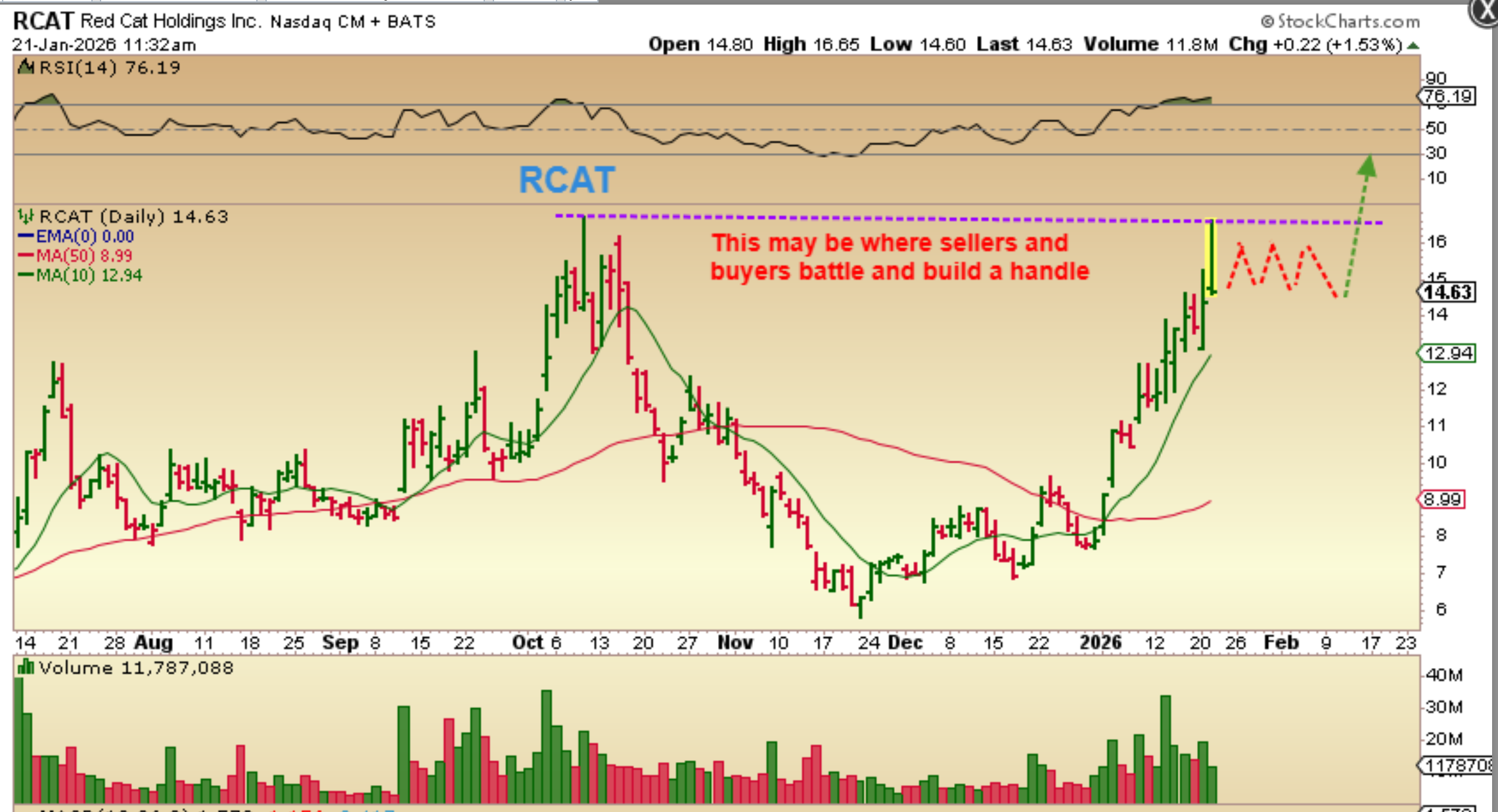 RCAT popped to the former highs and then dropped, so I posted that maybe it would begin to chop at the highs and give us a handle. RCAT then rallied after trumps comments too, closing up 8%, so now we’ll see if this can just breakout to new highs now (if a market dcl is in place).